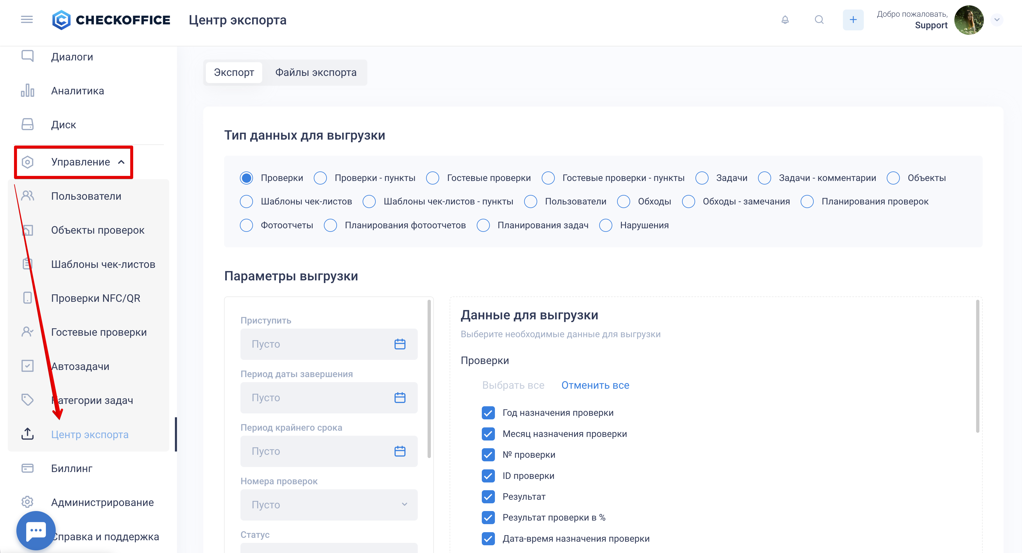 Центр экспорта — это универсальный инструмент для выгрузки данных из CheckOffice, который позволяет массово и выборочно экспортировать различные типы данных в файл для дальнейшего анализа.