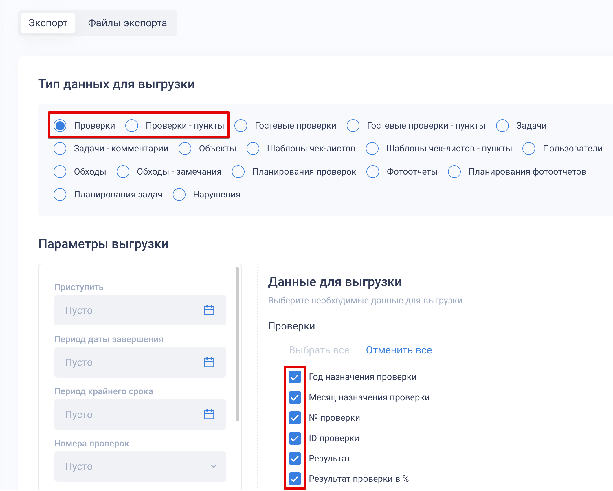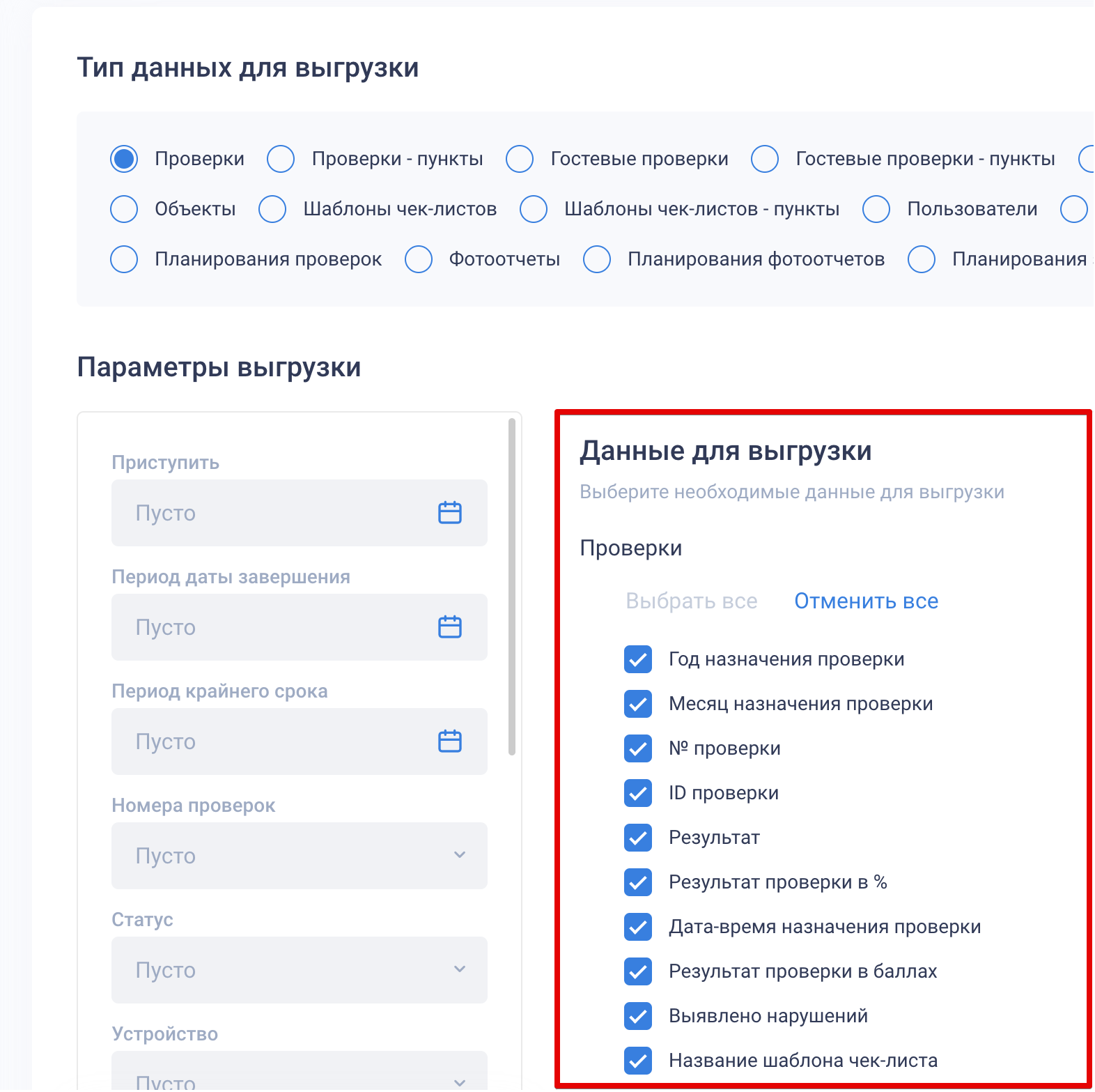 Если нужно выгрузить одновременно несколько типов данных, переключитесь на следующий тип данных для выгрузки и отметьте данные чек-боксами.