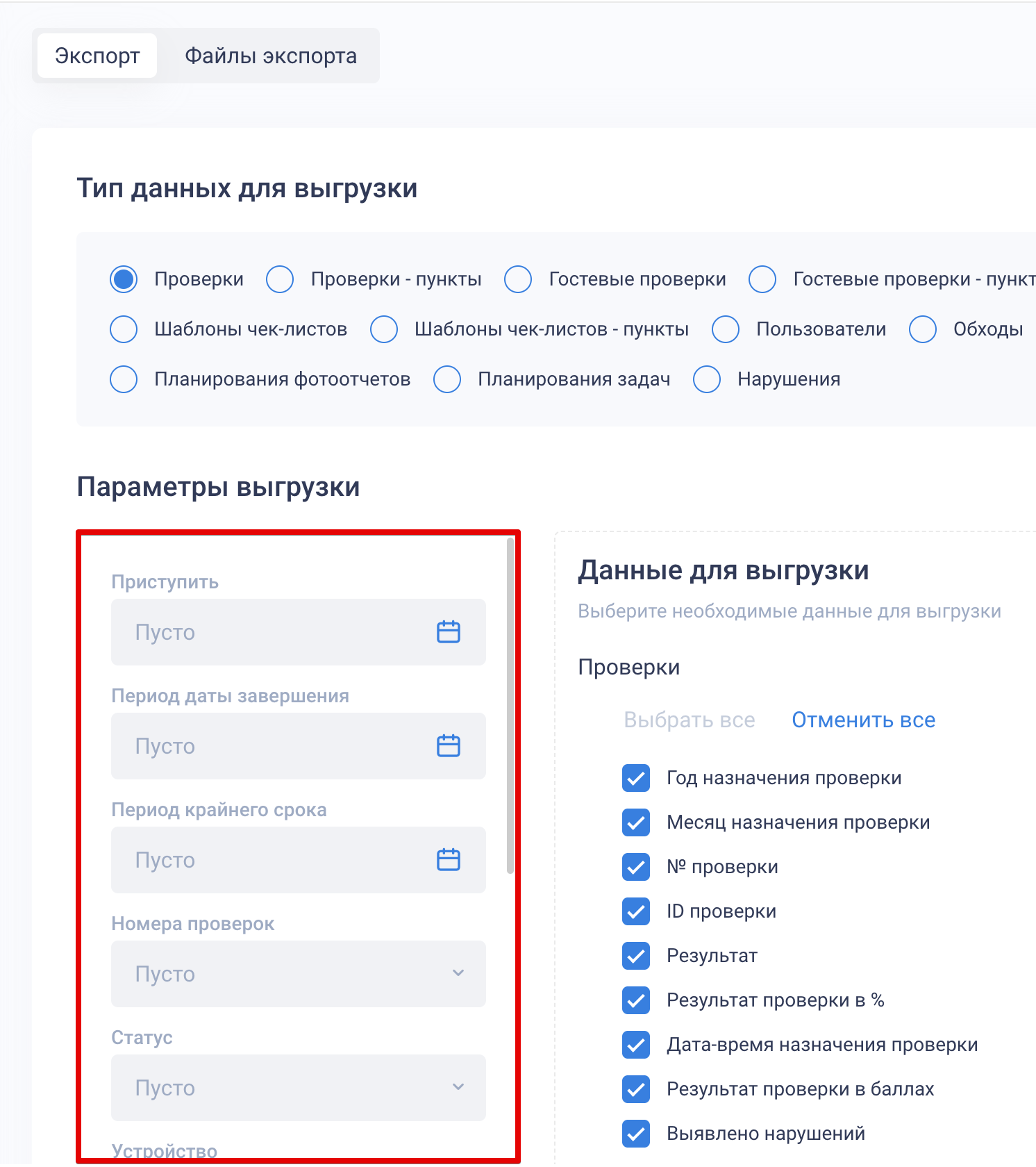На вкладке «Экспорт» вы можете выбрать тип данных для выгрузки в файл: