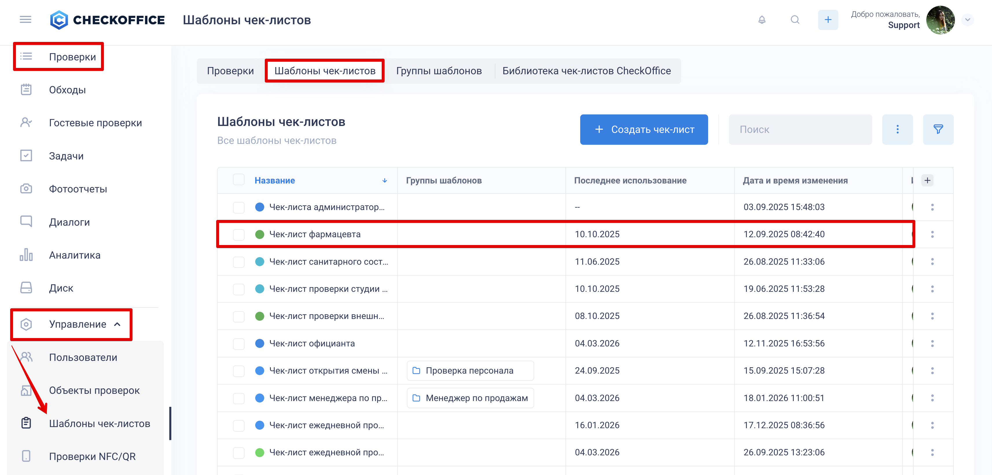Боковое меню слева > раздел «Проверки» > вкладка «Шаблоны чек-листов»или боковое меню слева > раздел «Управление» > подраздел «Шаблоны чек-листов» > вкладка «Шаблоны чек-листов»
