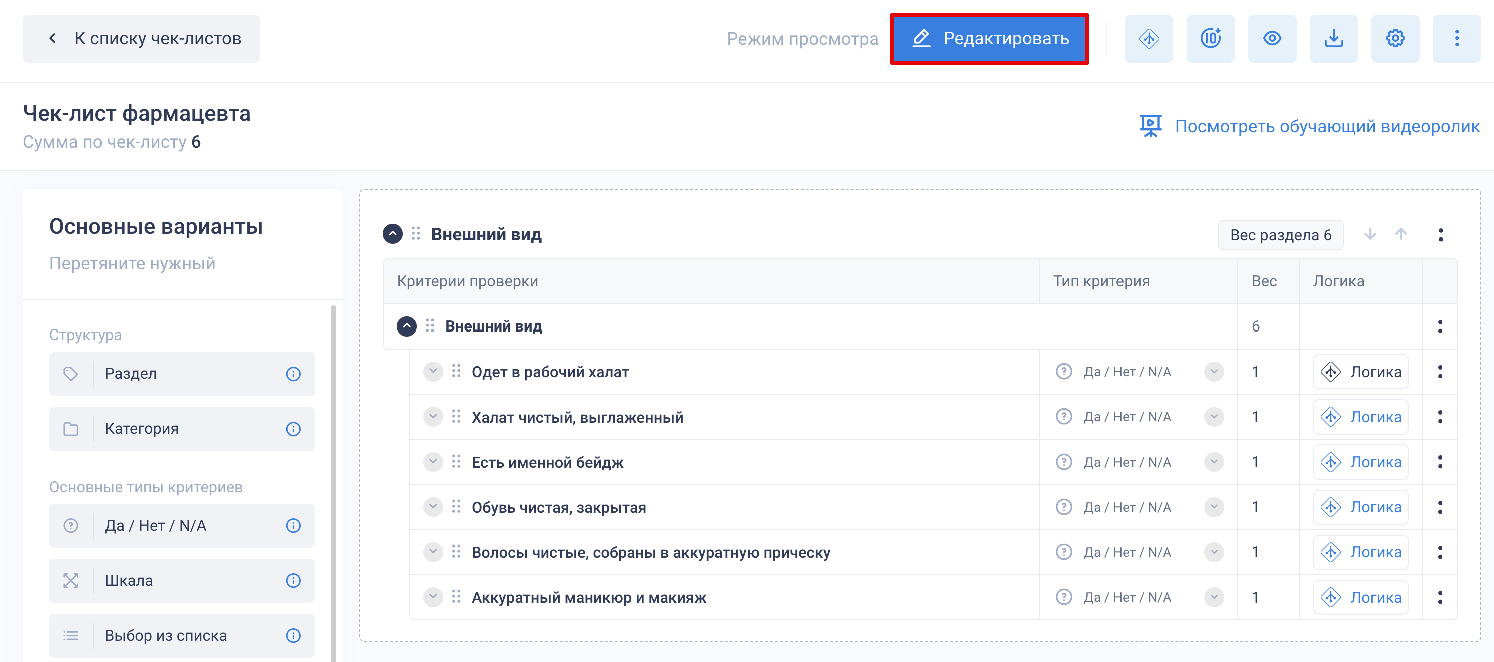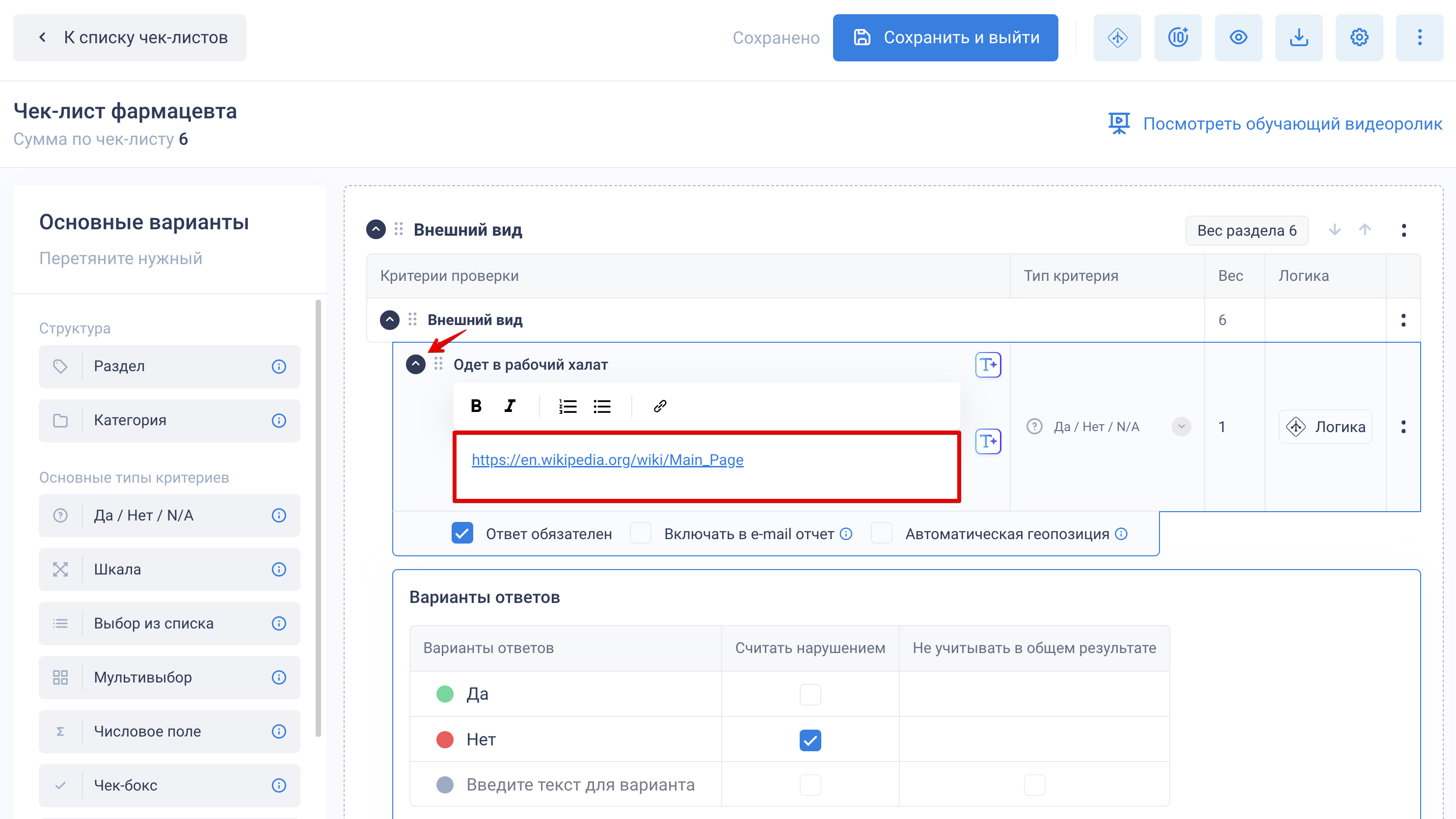 Кликните на строку с шаблоном чек-листа — откроется Конструктор. Чтобы перейти из режима просмотра в режим редактирования, нажмите «Редактировать» в верхней части экрана. Разверните необходимый критерий и в его описание вставьте ссылку на сторонний источник. Нажмите «Сохранить и выйти».