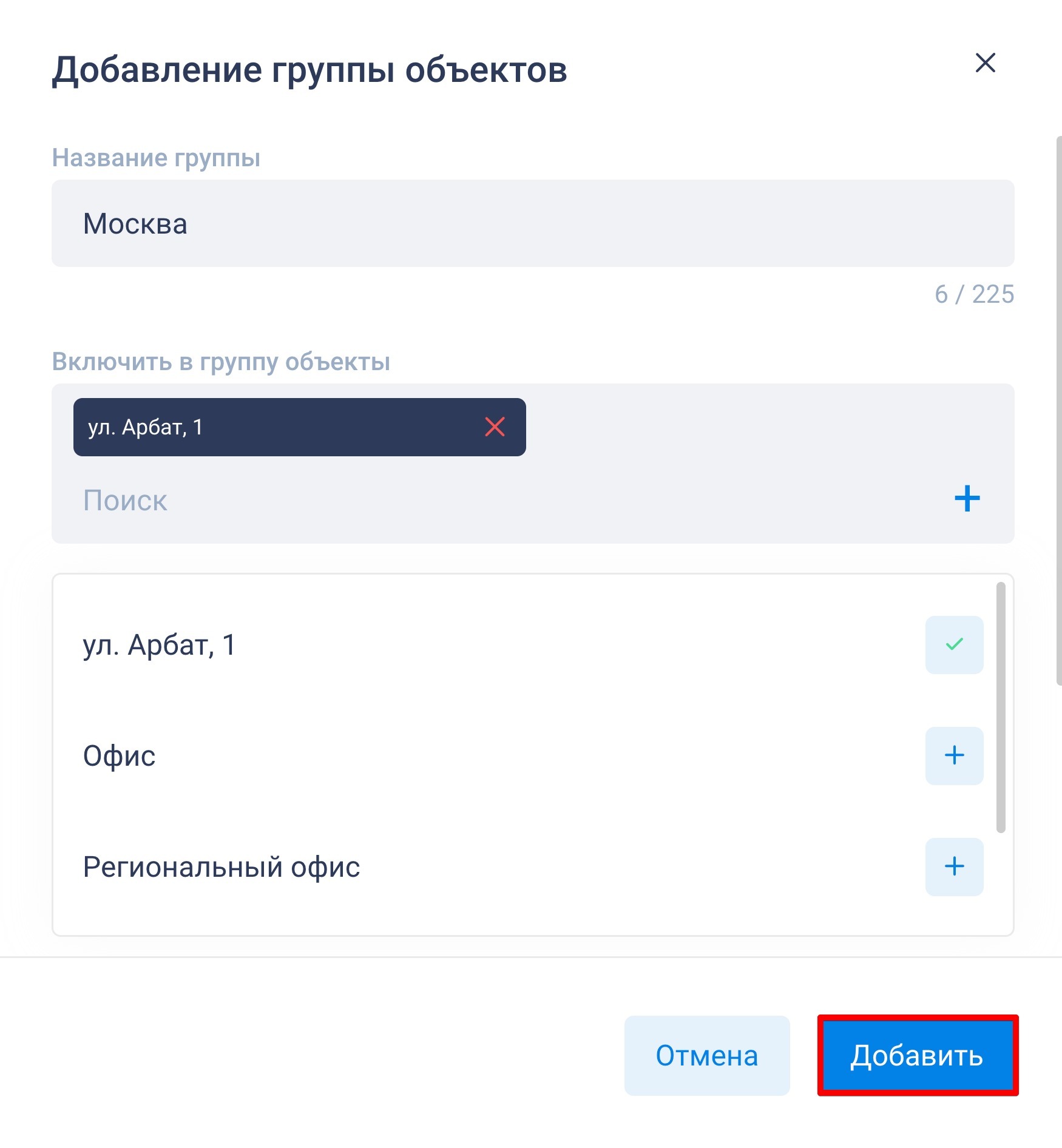 Нажмите на кнопку «+» в верхнем правом углу вкладки для добавления группы объектов. В открывшейся форме введите название группы и добавьте в нее объекты проверок.Внимание! Если объекты проверок не выбраны, то в группу по умолчанию добавятся все существующие на площадке объекты проверок