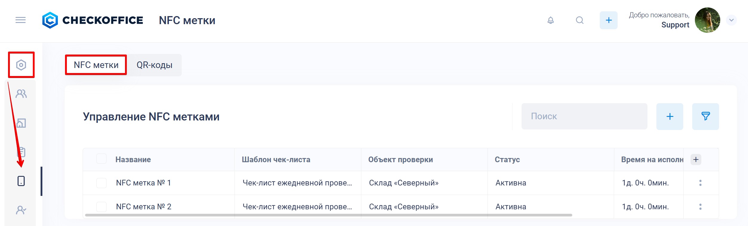Боковое меню слева > раздел «Управление» > подраздел «Проверки NFC/QR» > вкладка «NFC метки»