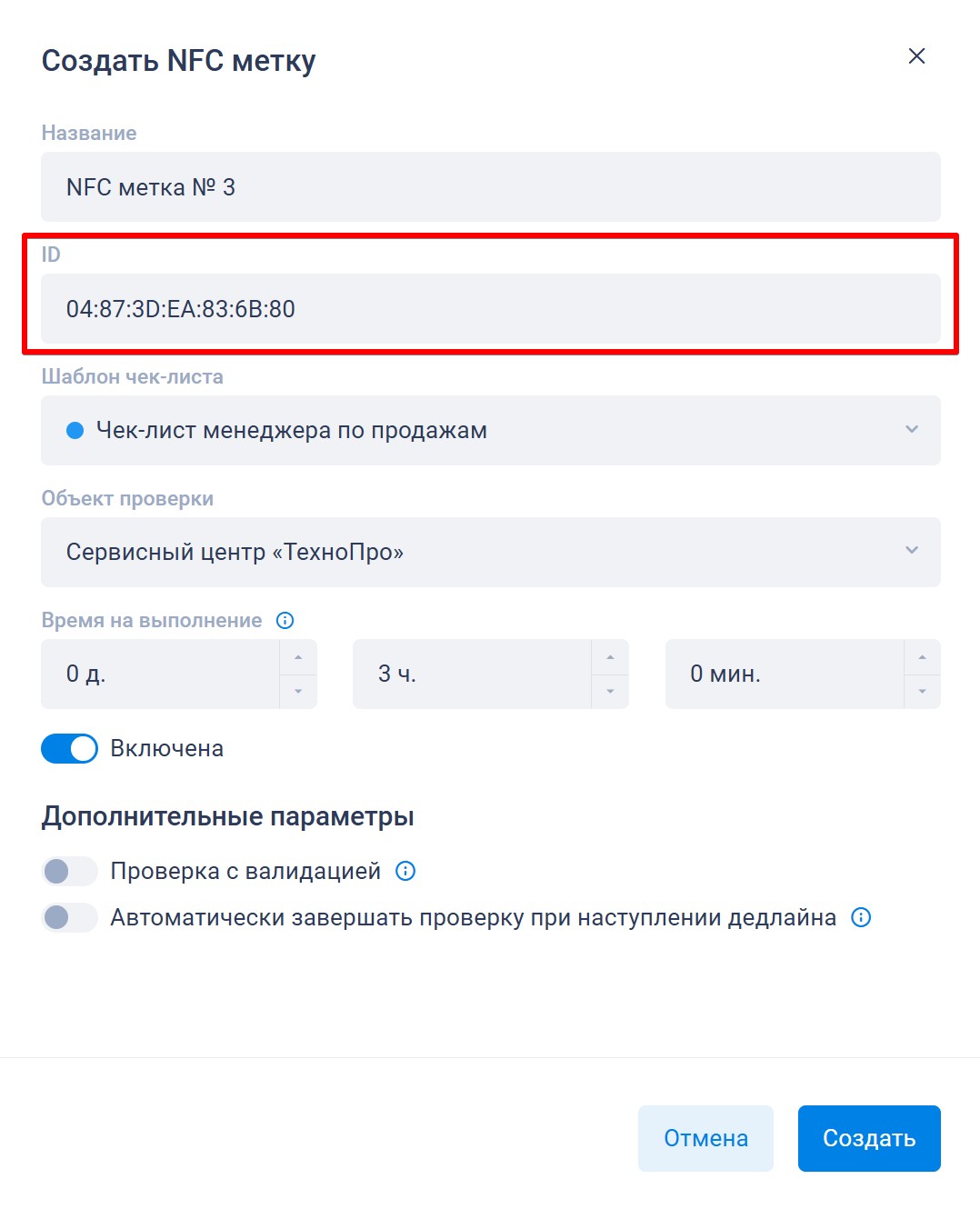 Время на выполнение — отсчитывается с момента сканирования NFC метки. После наступления дедлайна проверка получает статус «Просрочено»
