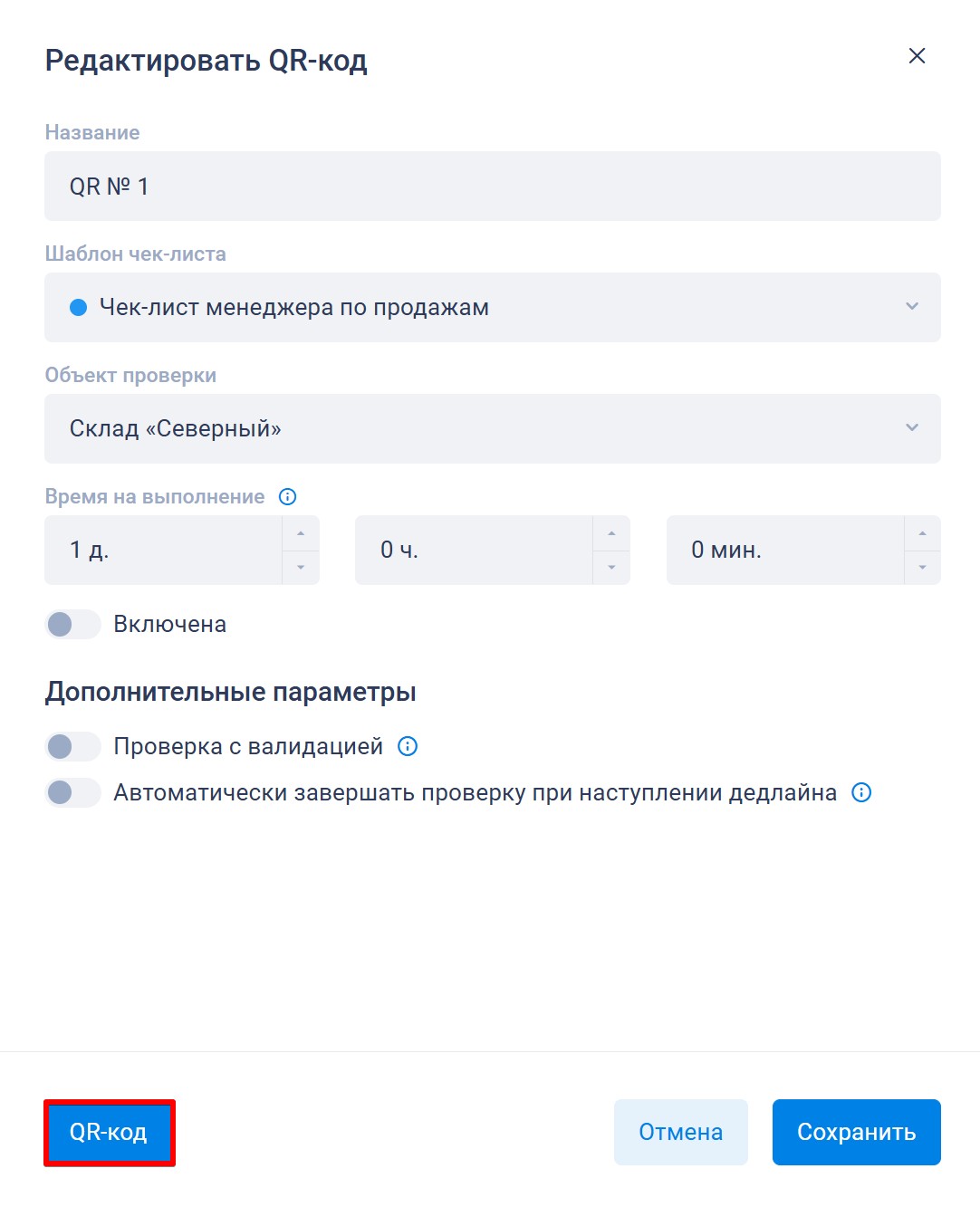 Время на выполнение — отсчитывается с момента сканирования QR-кода. После наступления дедлайна проверка получает статус «Просрочено»