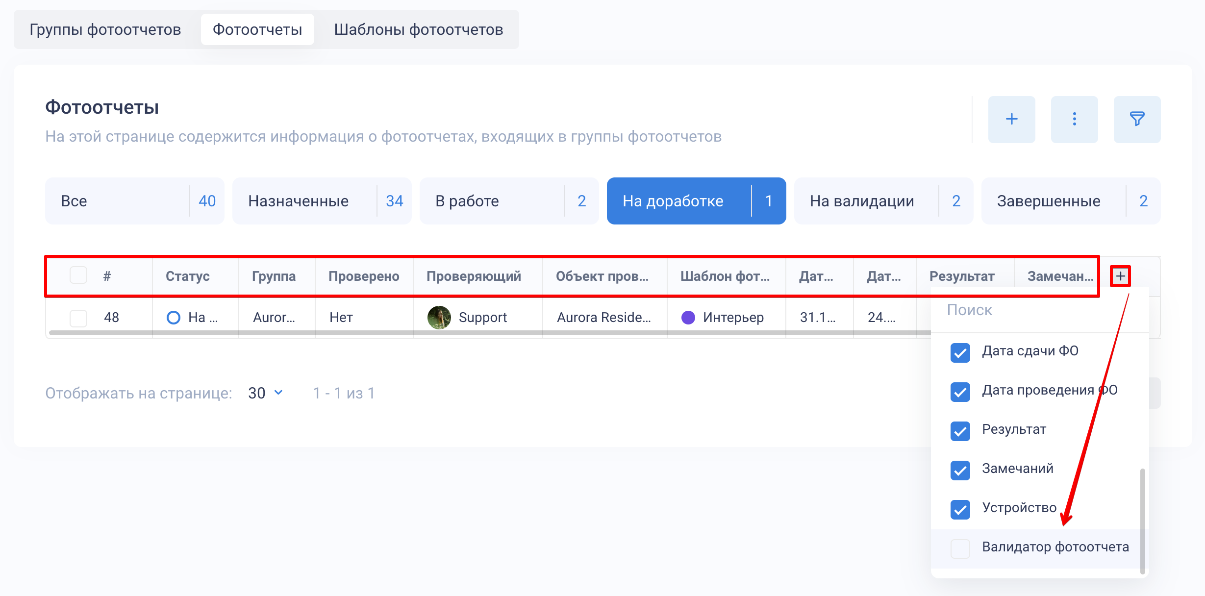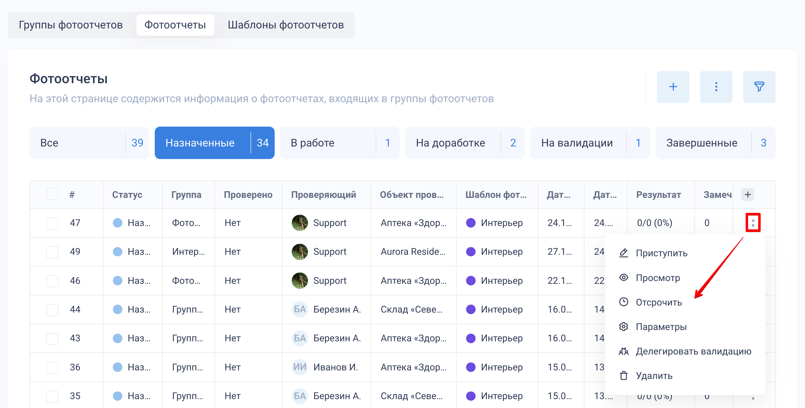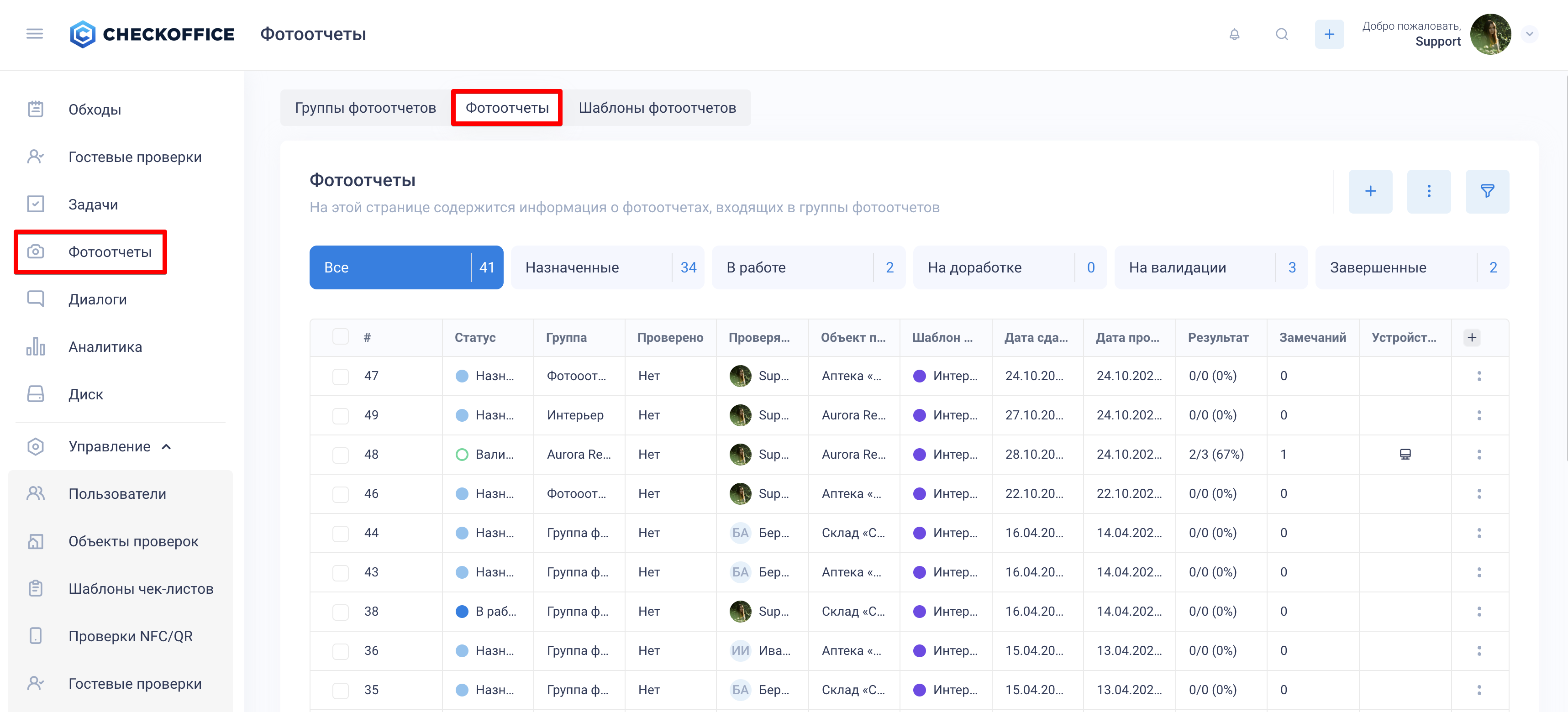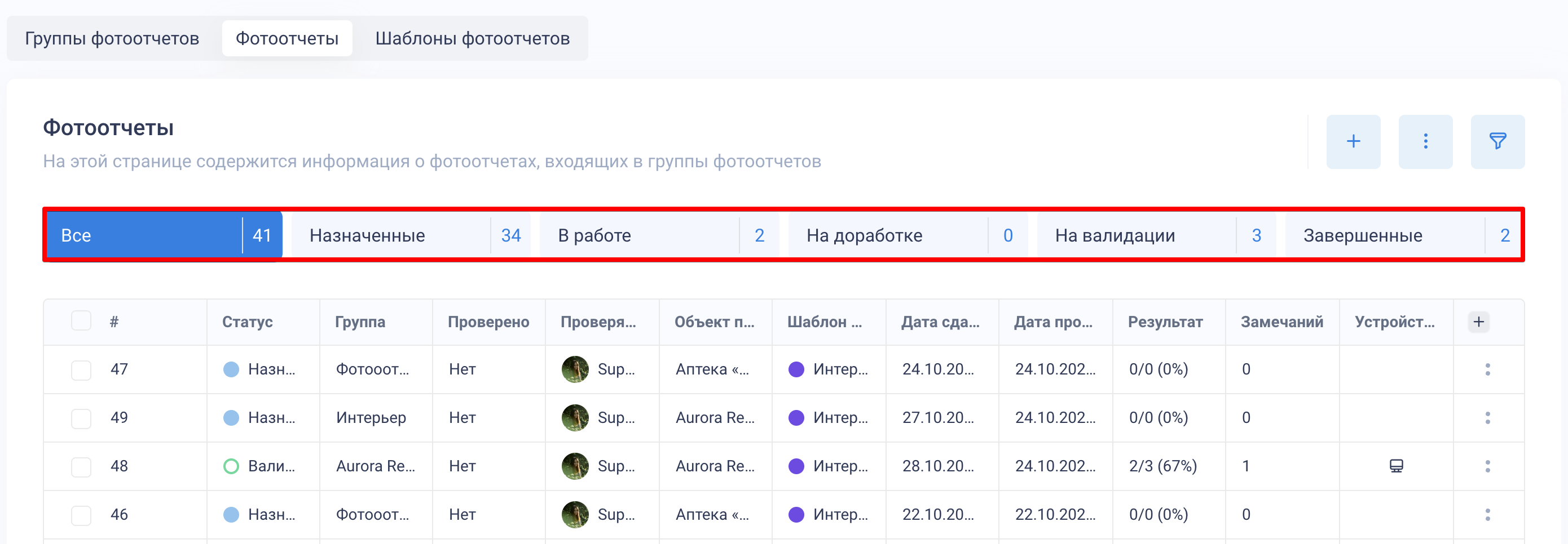 Если вкладки «Группы фотоотчетов» и «Шаблоны фотоотчетов» отвечают за управление структурами (группами и шаблонами), то вкладка «Фотоотчеты» предназначена для работы с отдельными фотопроверками — их результатами, статусами и отчетностью.