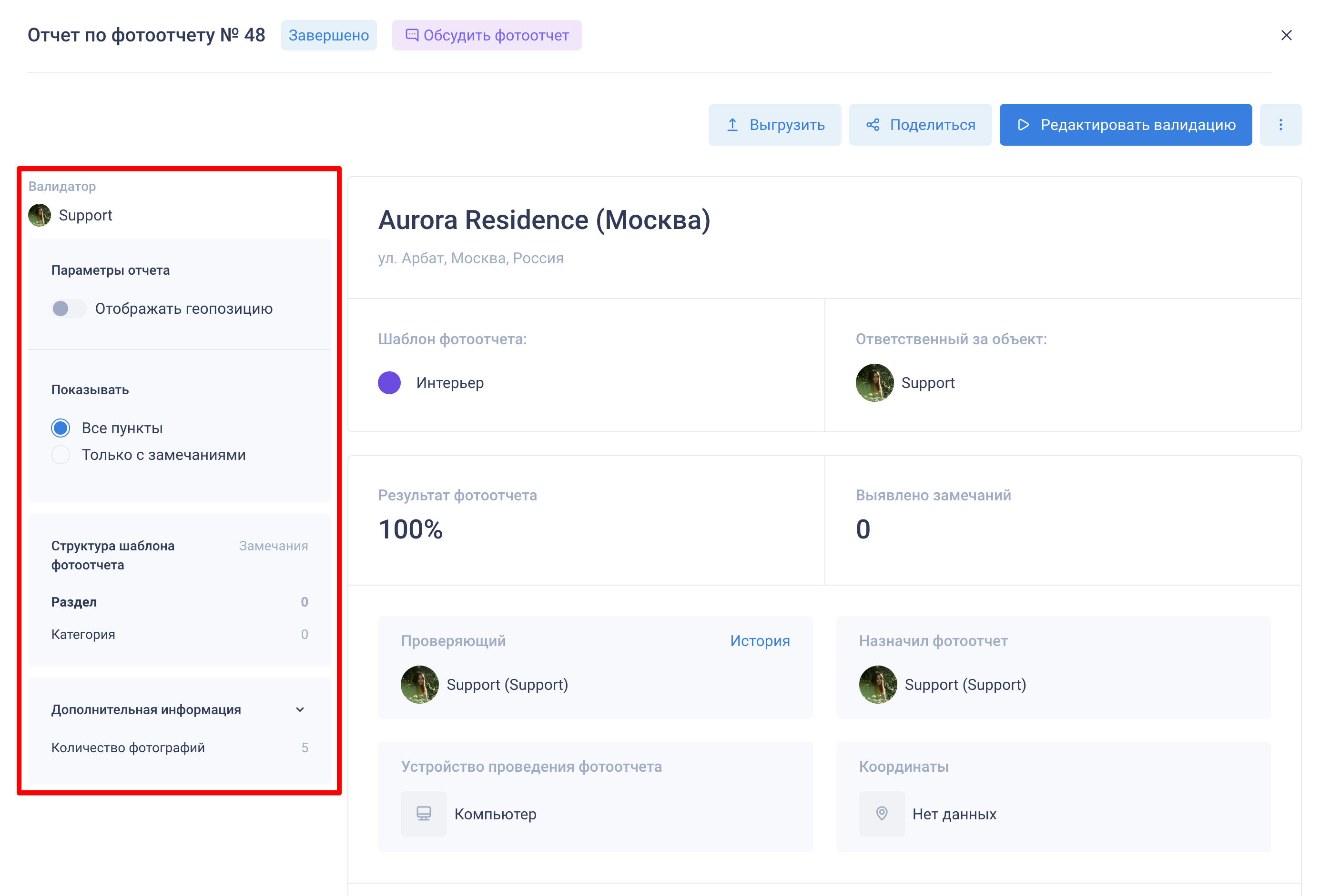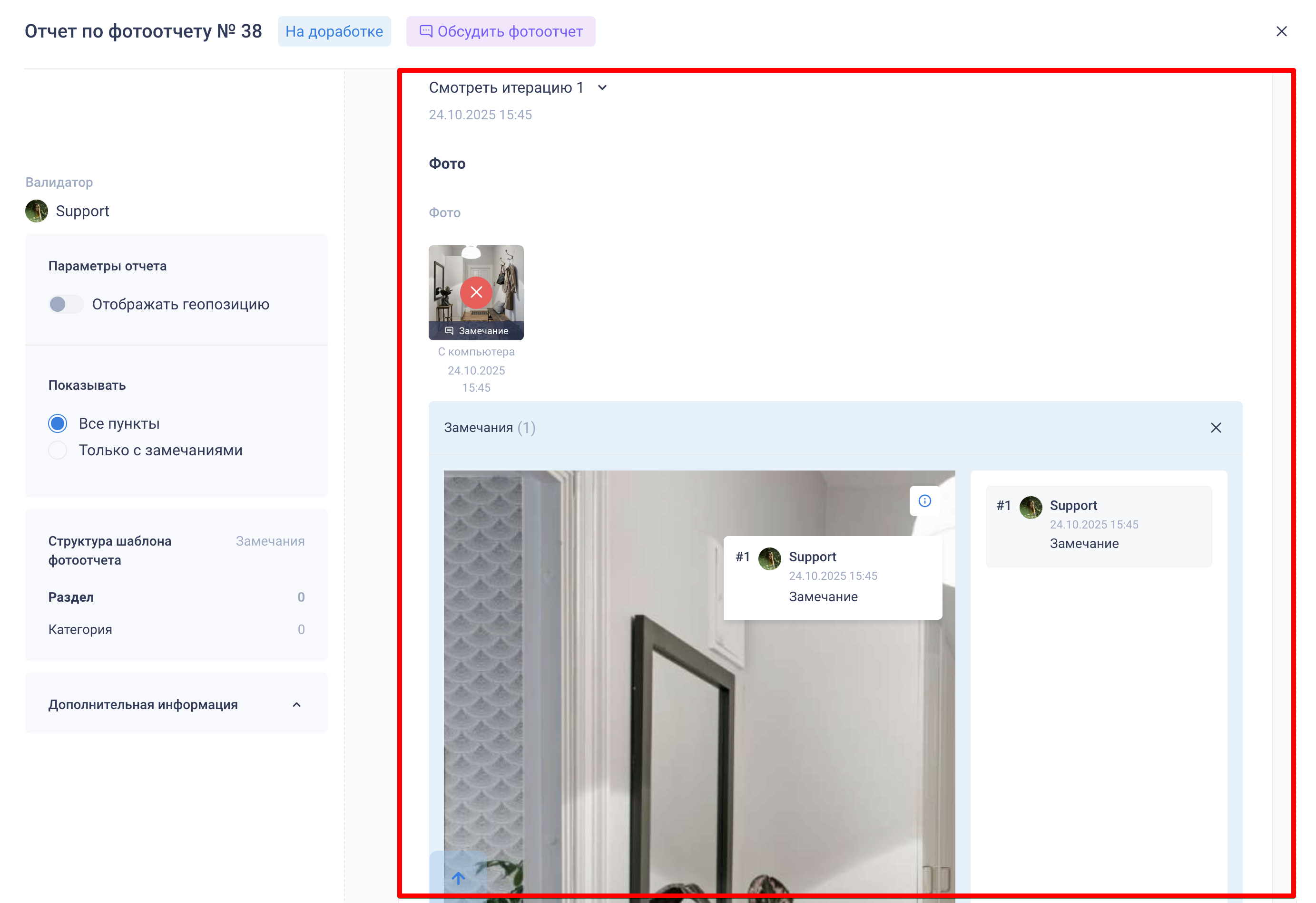Результат фотоотчета в % — зависит от количества замечаний в нем