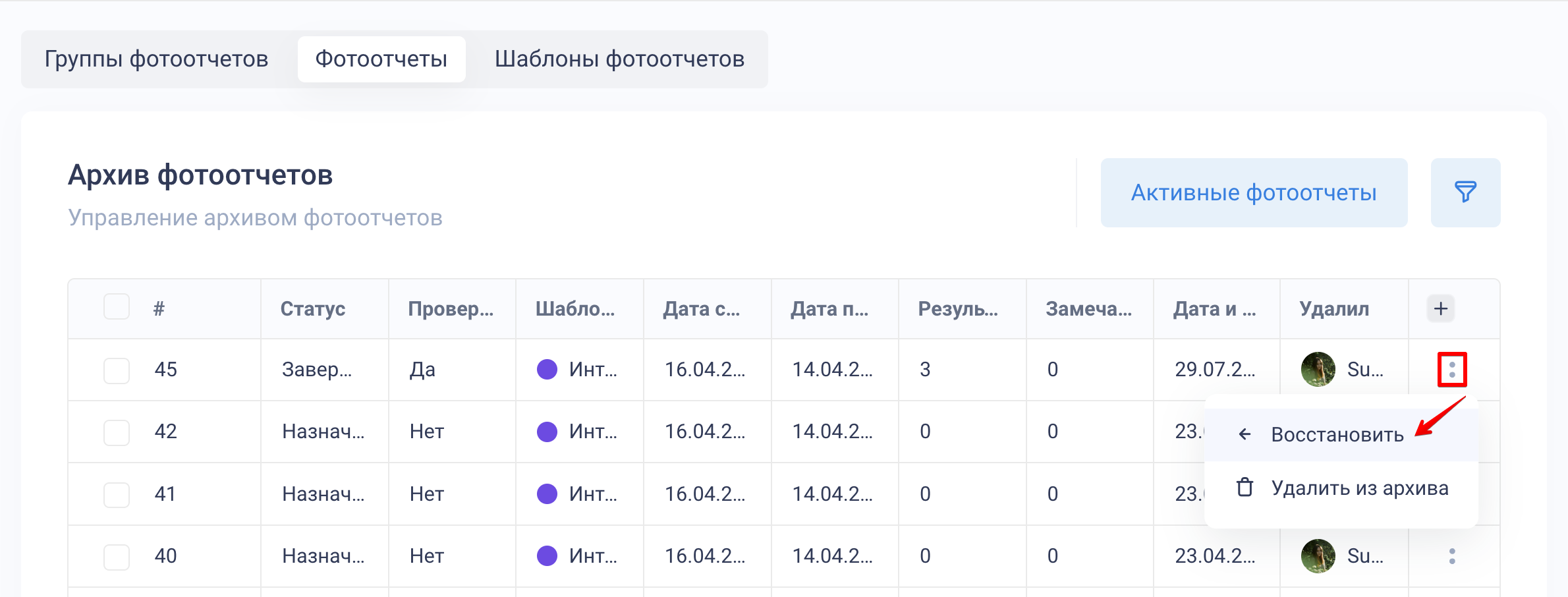 Удалить — перенос в архив; если случайно удалили, фотоотчет можно восстановить