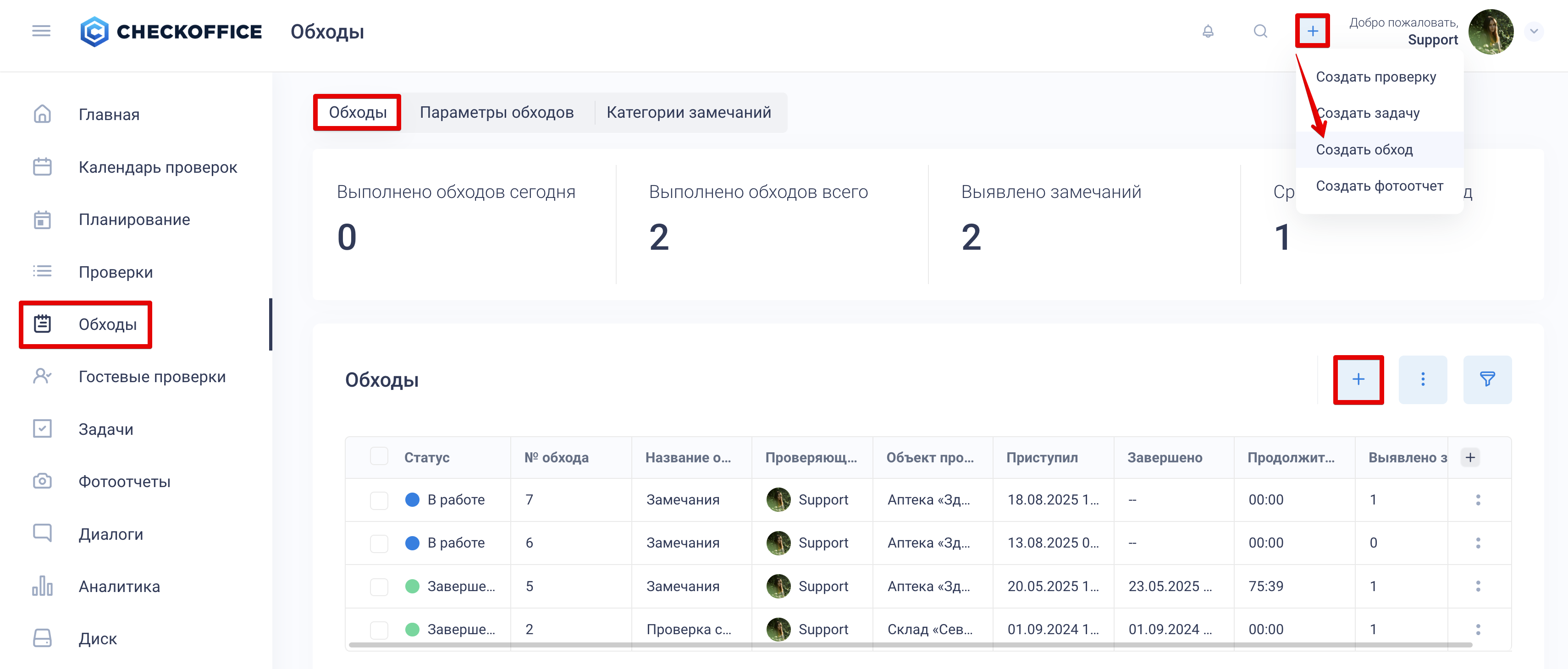 Главное меню: модуль «Обходы» доступен в боковом меню слева