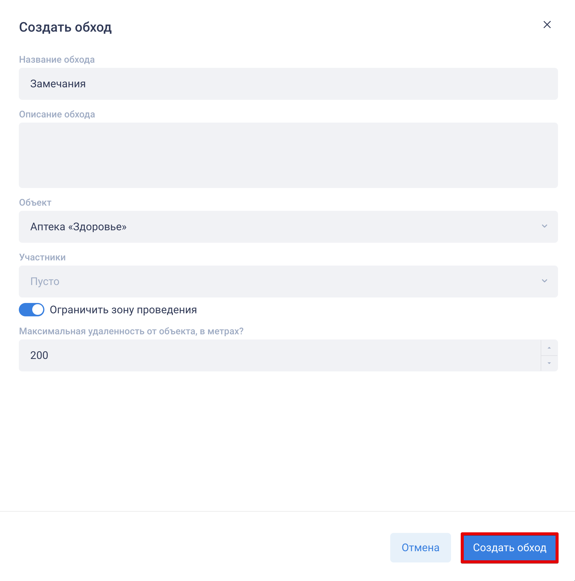Создание обхода: нажав на кнопку «+» в разделе «Обходы» или в верхнем правом углу > и выбрав функцию «Создать обход» (см. скриншот выше), с помощью простой и интуитивно понятной формы вы можете задать основные параметры обхода: название, описание, объект проверок, добавить участников, а также включить контроль геопозиции. Участники — добавление ФИО присутствующих во время обхода. ⚠️ Обратите внимание: проводить обход может только его создатель.
