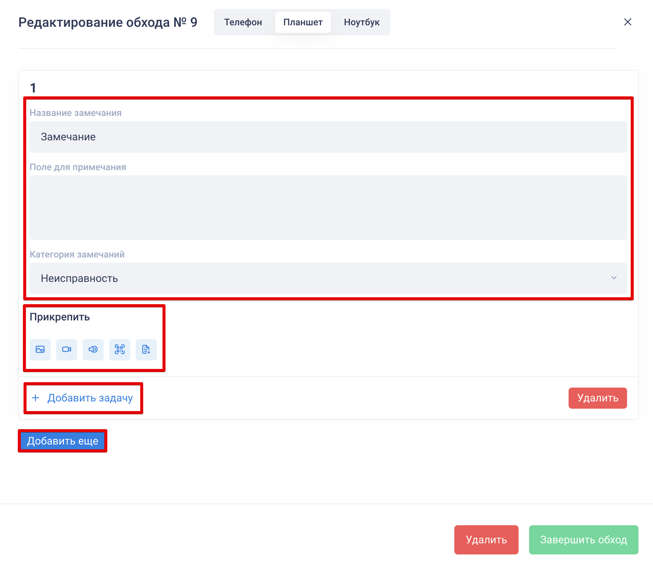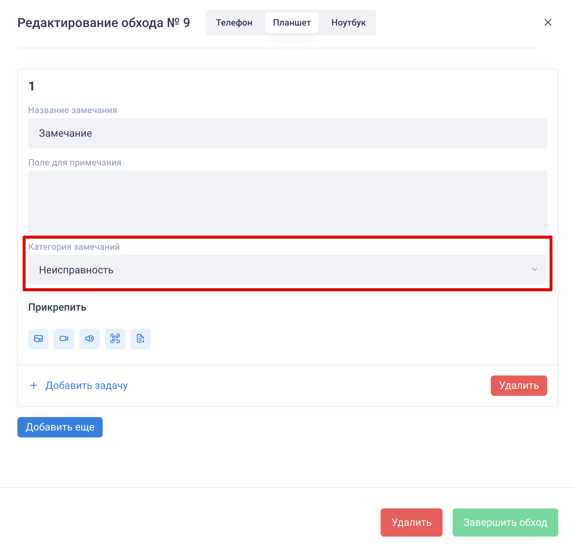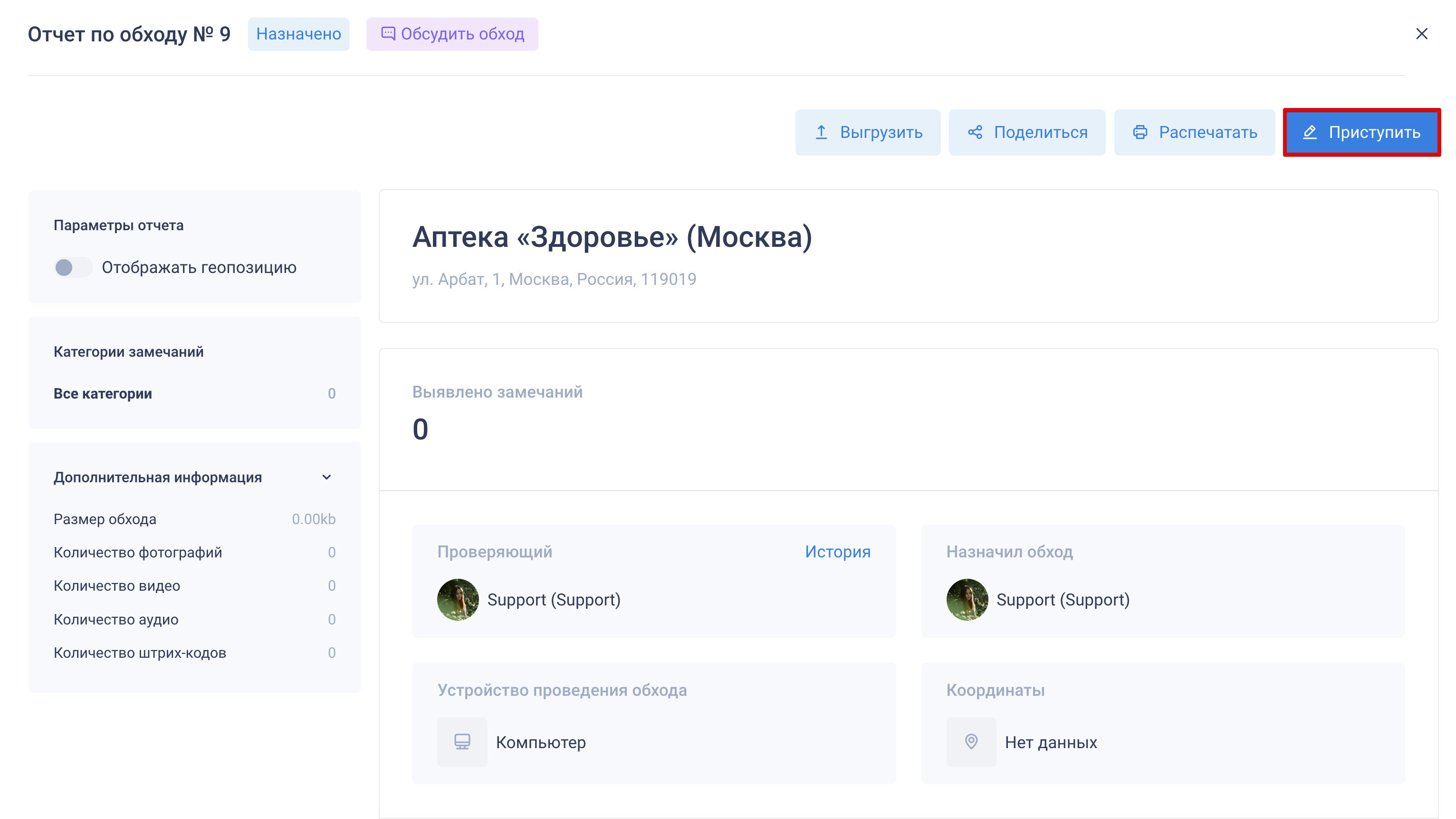 Как приступить: откройте обход и нажмите «Приступить». Проверяющий фиксирует замечания, классифицирует их по категориям и, при необходимости, добавляет атрибуты (фотографии, видеозаписи, геолокацию и т. д.), может создавать задачи с привязкой к замечаниям. Замечания нумеруются автоматически. Чтобы создать диалог по обходу, нажмите кнопку «Обсудить»