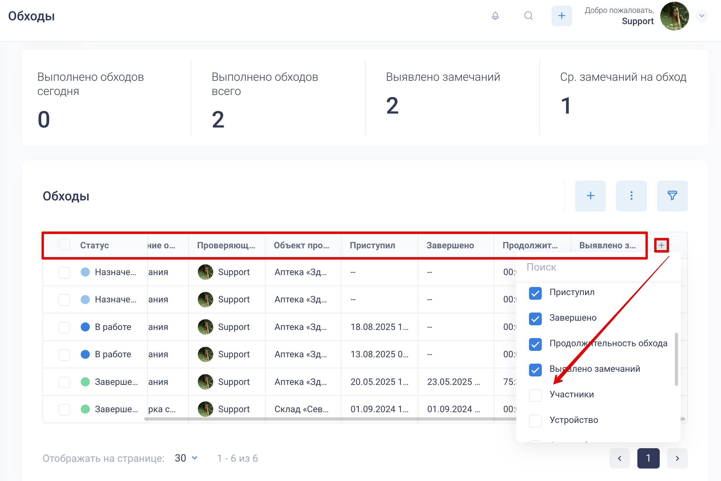 Аналитика и отчетность: информация собирается в основной таблице раздела «Обходы». В ней фиксируются: статус и № обхода, его название, проверяющий, объект проверок, дата и время начала и время завершения, продолжительность, а также другие параметры, которые можно добавить, нажав на «+» в шапке таблицы.