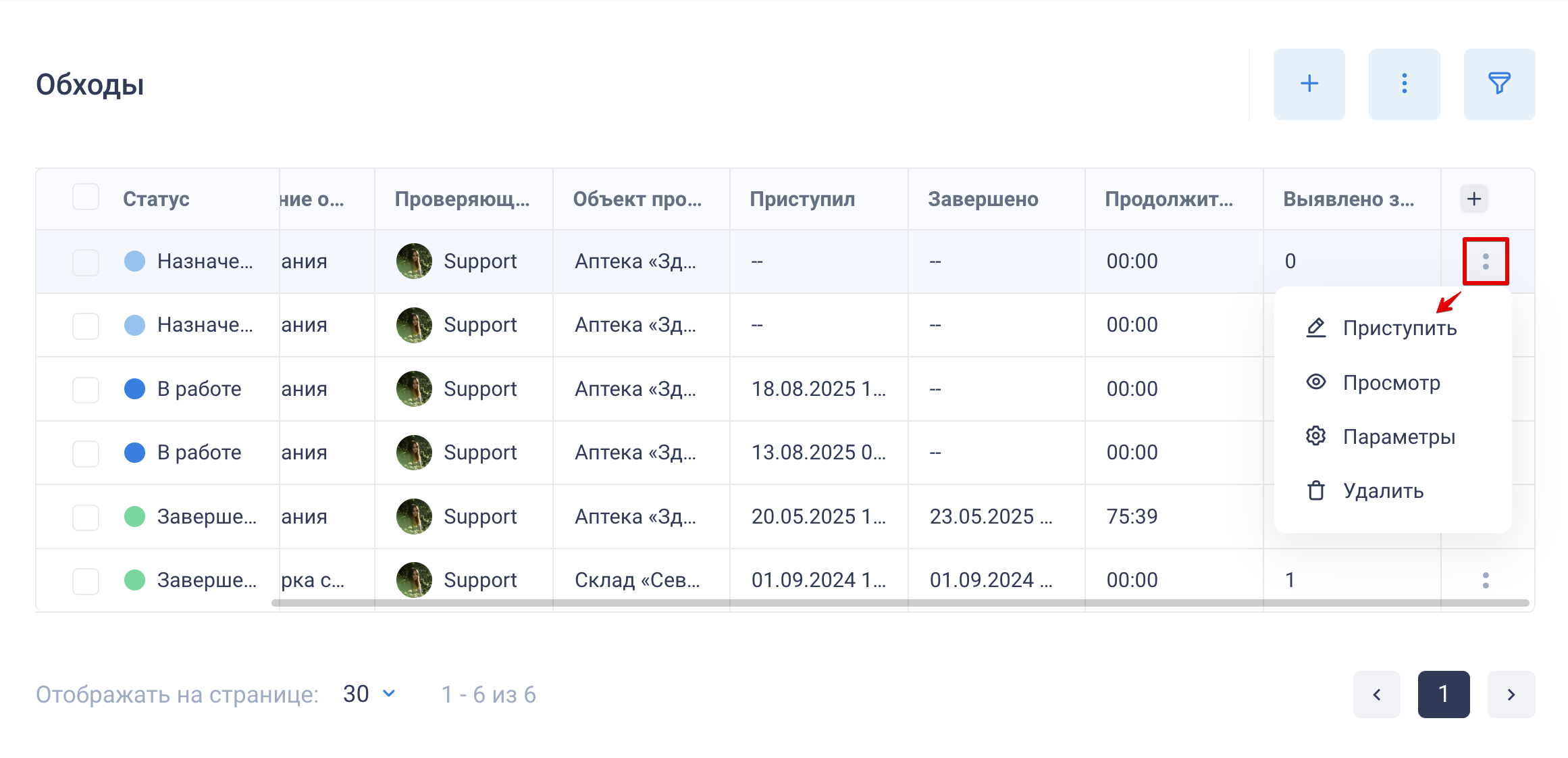 Действия с обходами: чтобы перейти к действиям, нажмите кнопку «:» справа.
