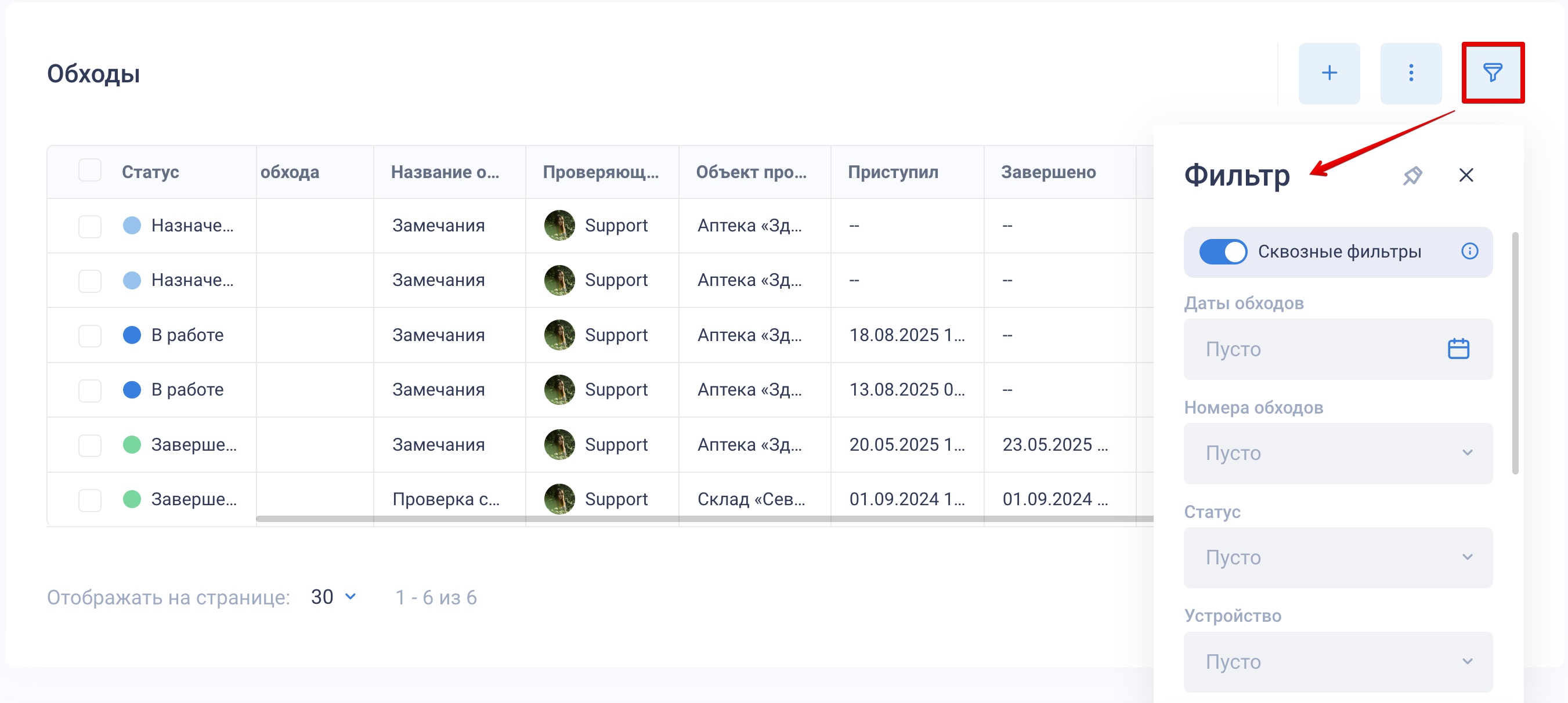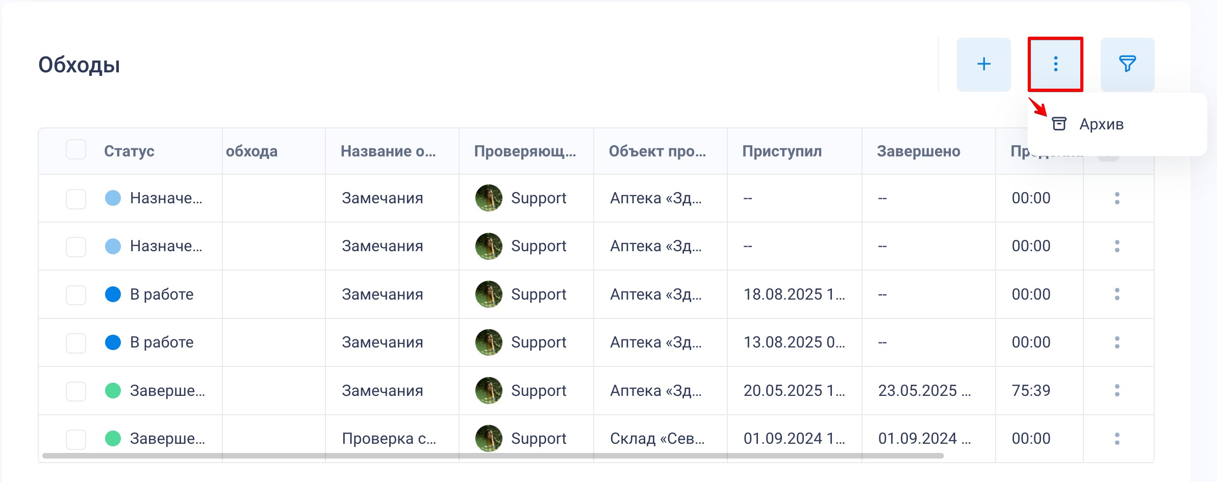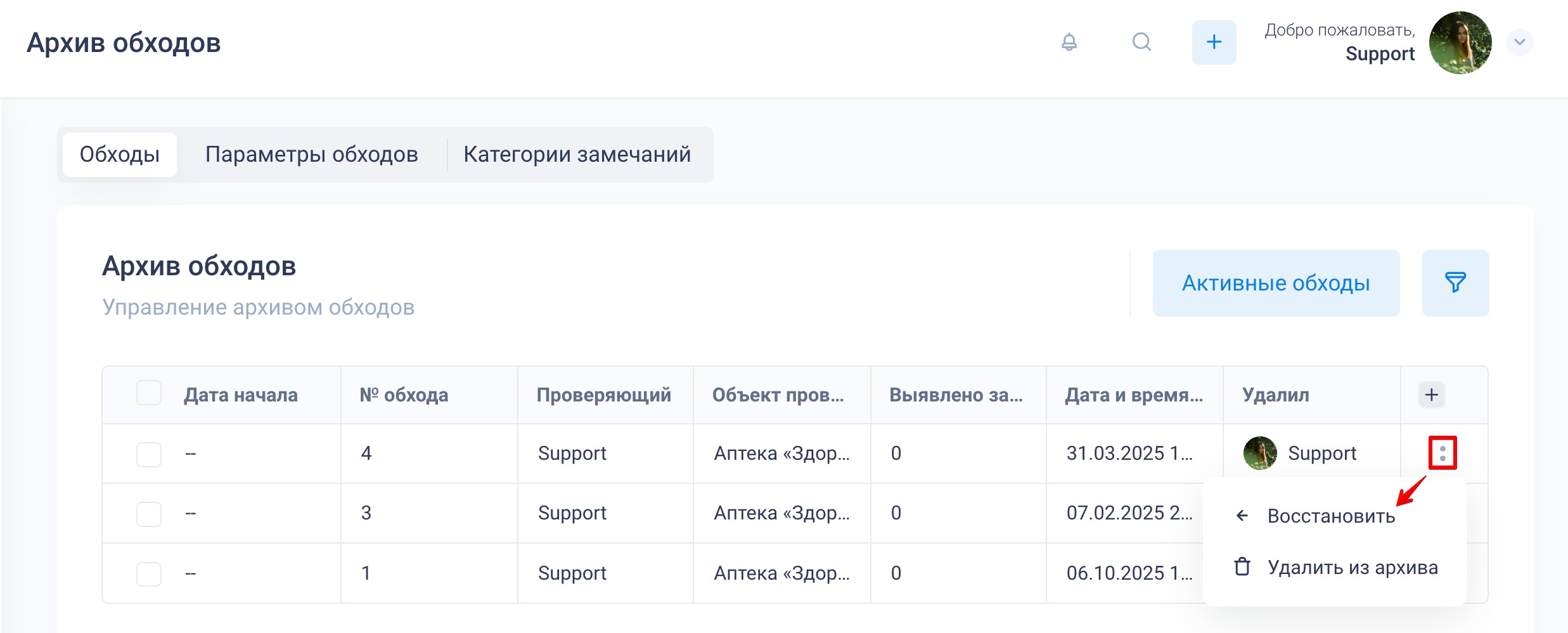 Архив: удаленные обходы попадают в архив, откуда их можно восстановить или удалить окончательно. Для перехода к архиву в разделе «Обходы» нажмите «⋮». Чтобы восстановить обход или удалить его, используйте кнопку «:» в столбце справа от обхода