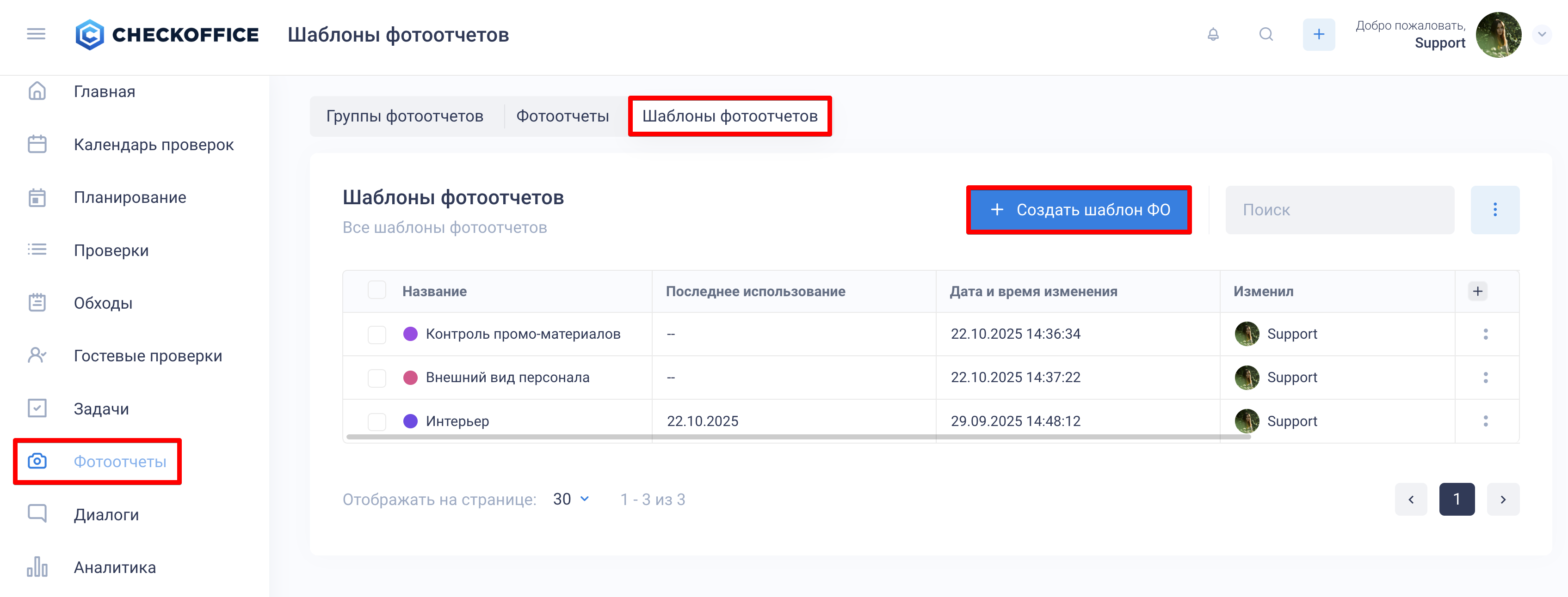 Боковое меню слева > раздел «Фотоотчеты» > вкладка «Шаблоны фотоотчетов»