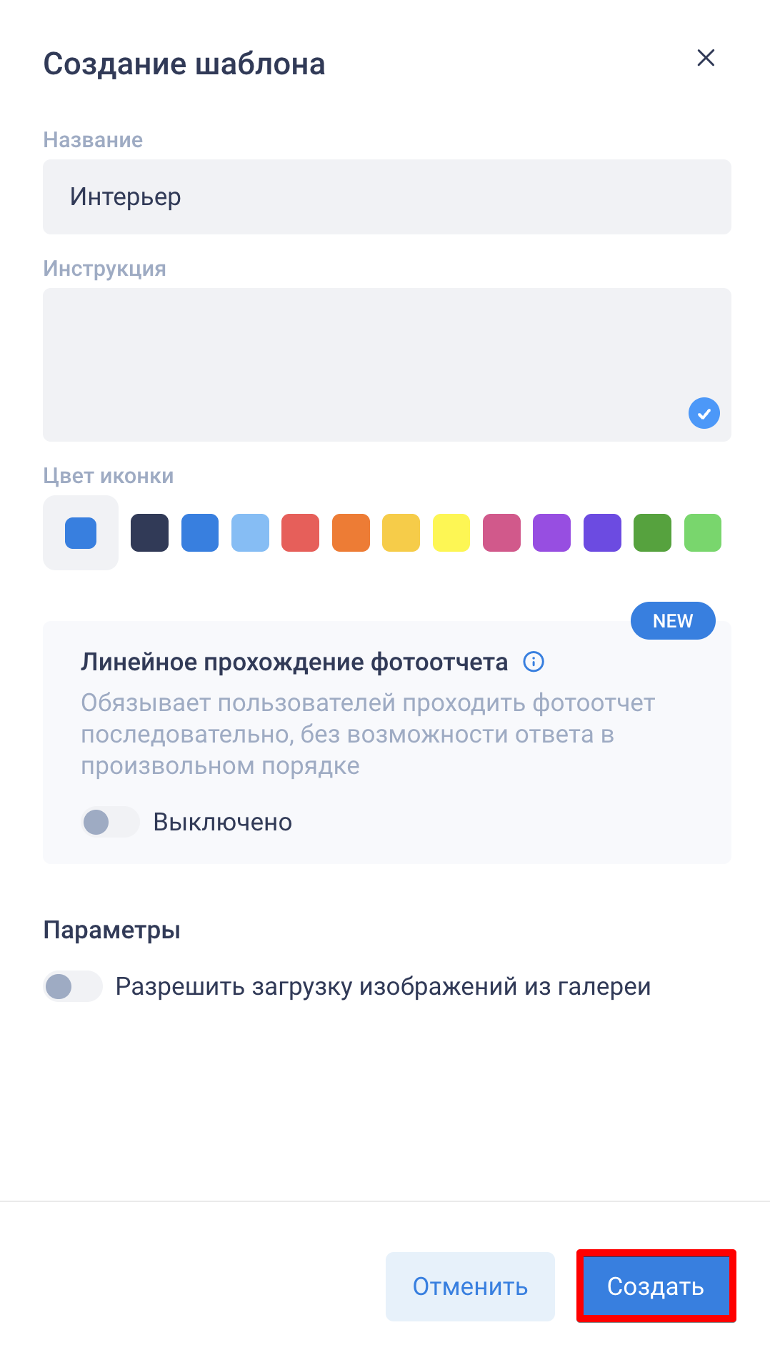 Нажмите кнопку «Создать» — шаблон фотоотчета появится в общем списке и откроется для формирования.
