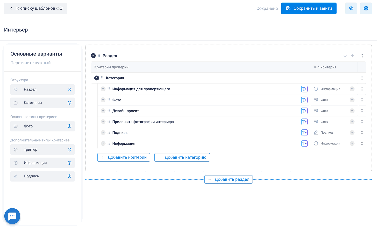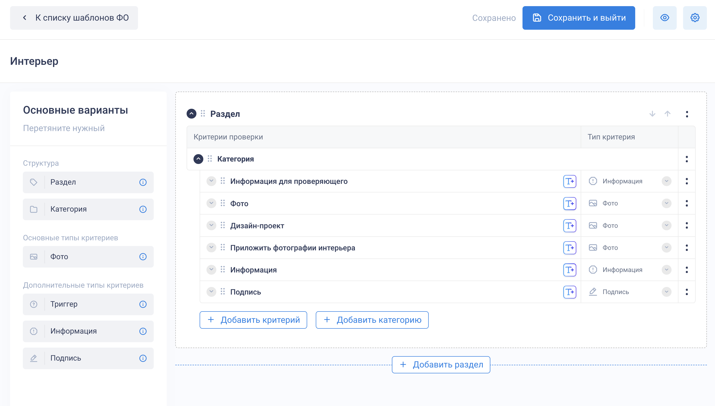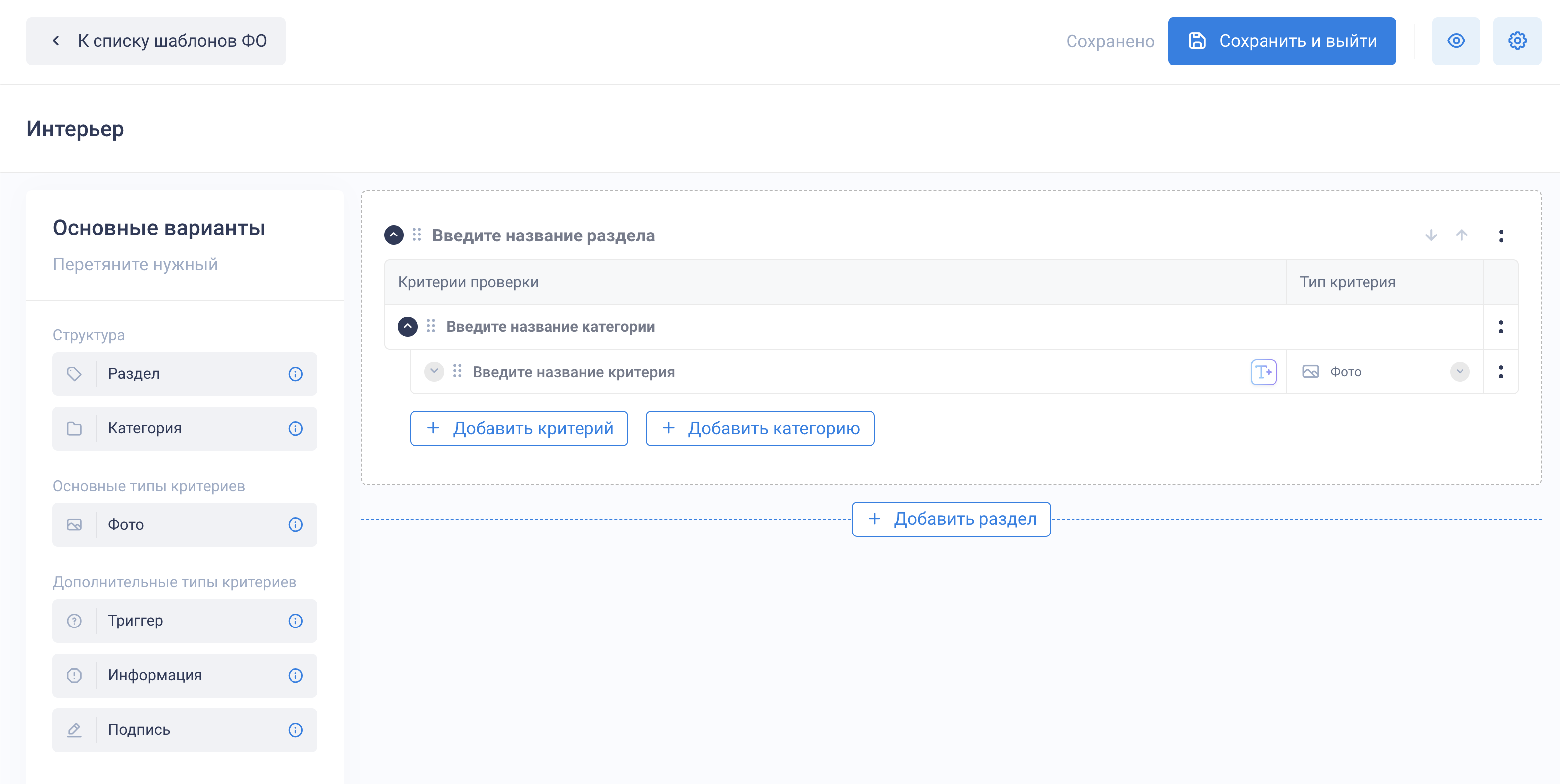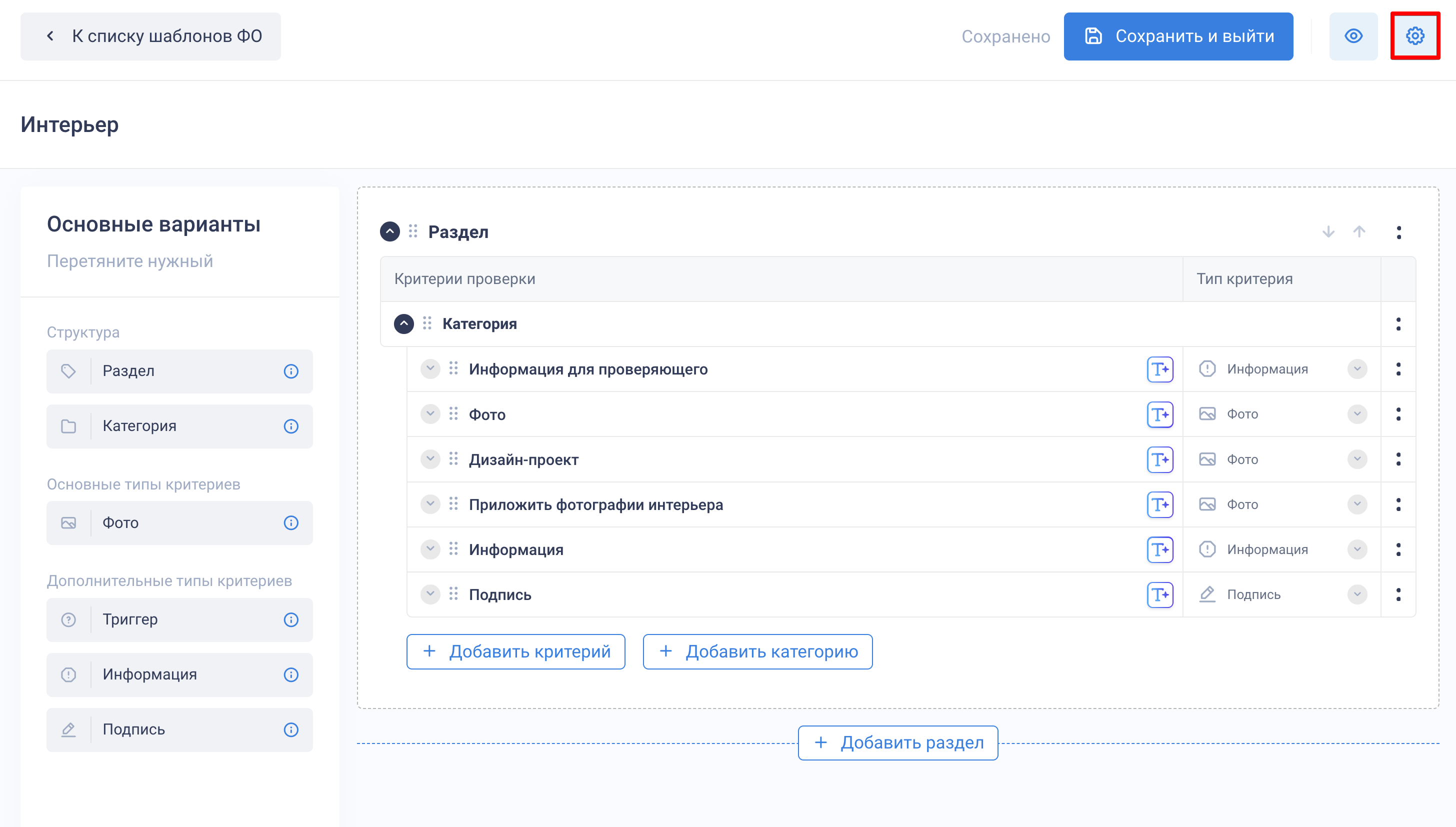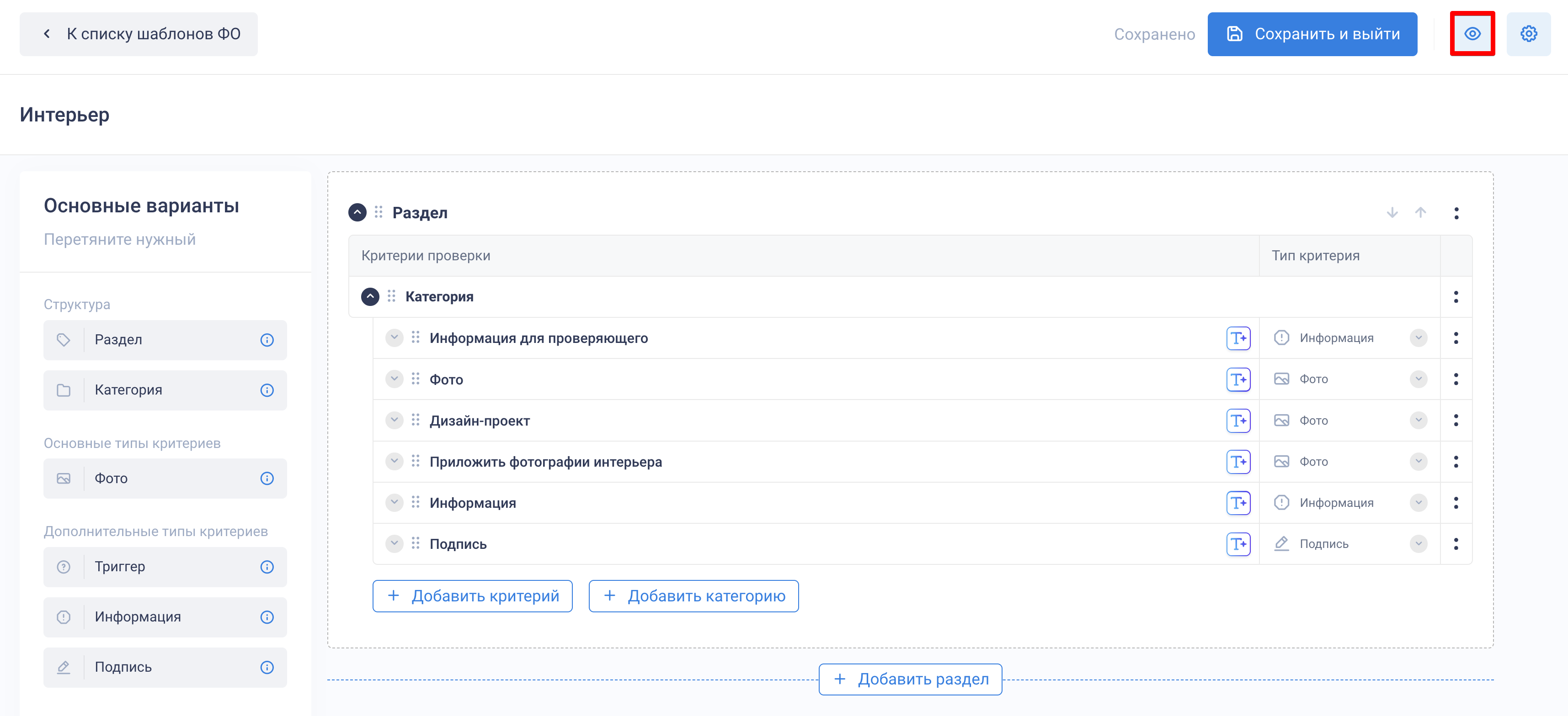 Чтобы проверить, как шаблон отображается у проверяющего, нажмите кнопку «Предпросмотр» с иконкой глаза 👁️.