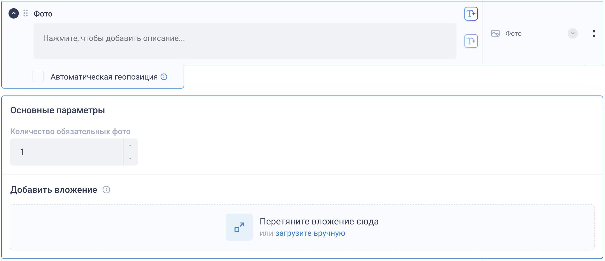 «Фото» — критерий для добавления фотографий. В настройках можно выбрать, сколько фотографий требуется обязательно добавить в фотоотчет