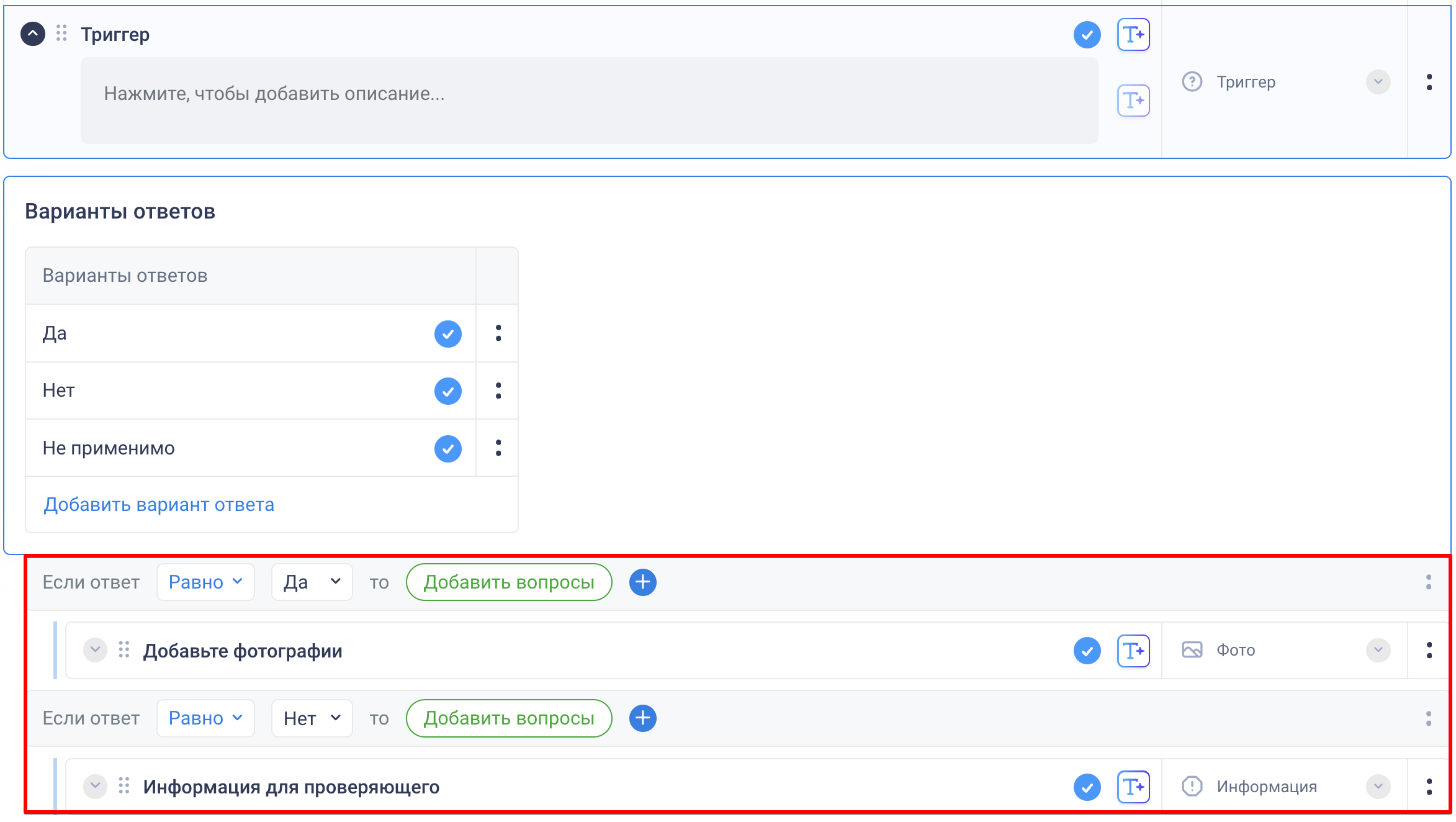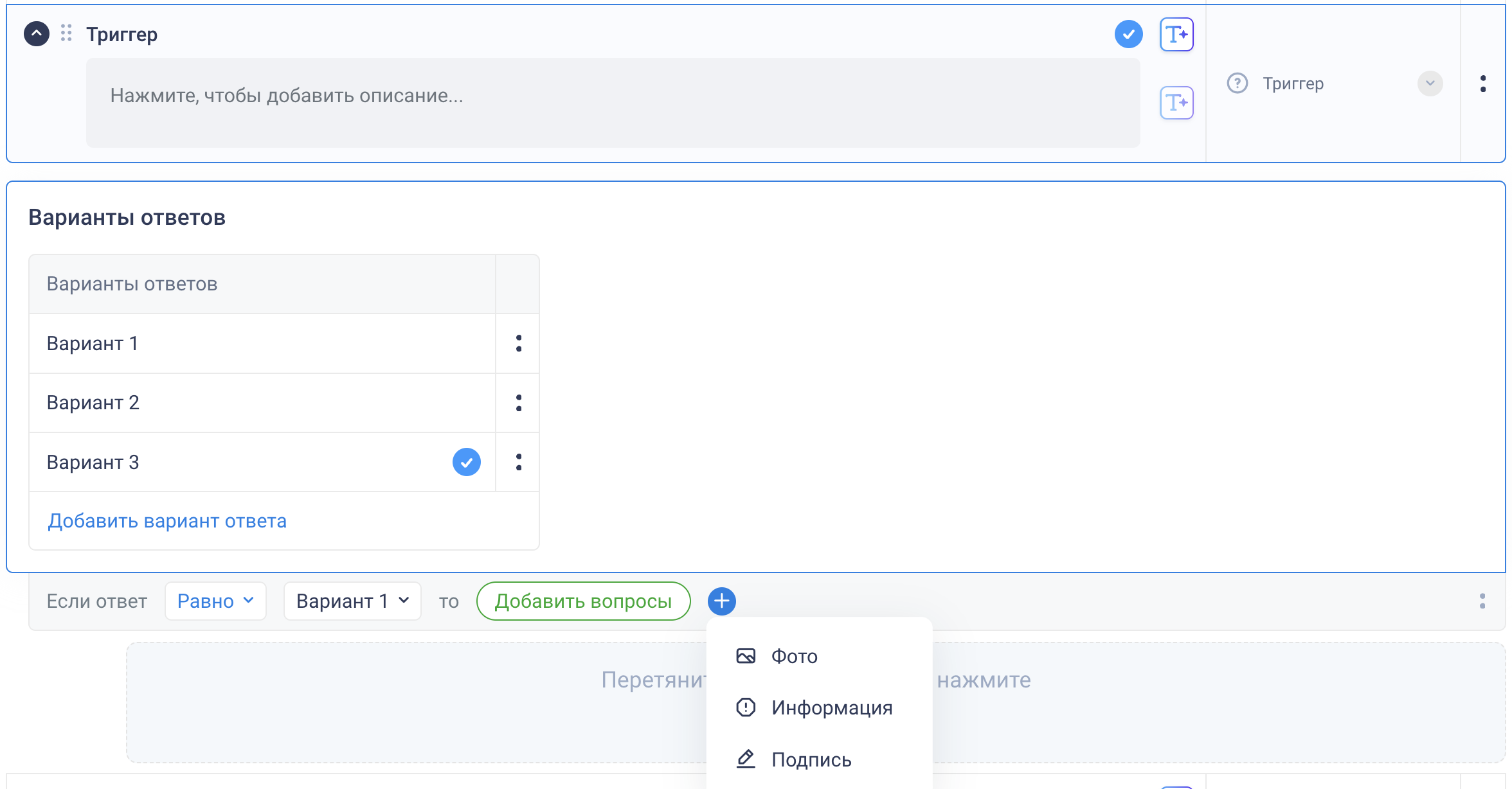 «Триггер» — это дополнительный тип критерия, который позволяет задать вопрос с вариантами ответов и настроить «Логику» действия в зависимости от выбранного варианта.