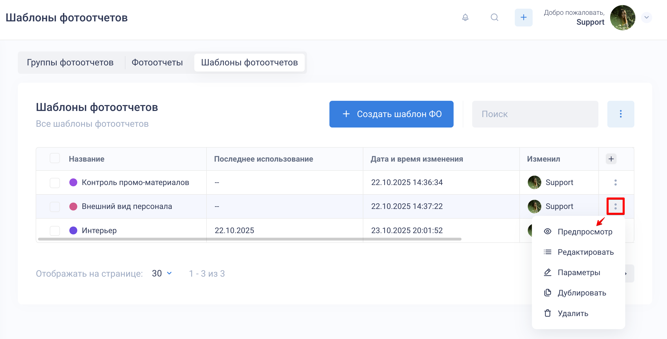 👁️ Предпросмотр — откроет шаблон в режиме просмотра