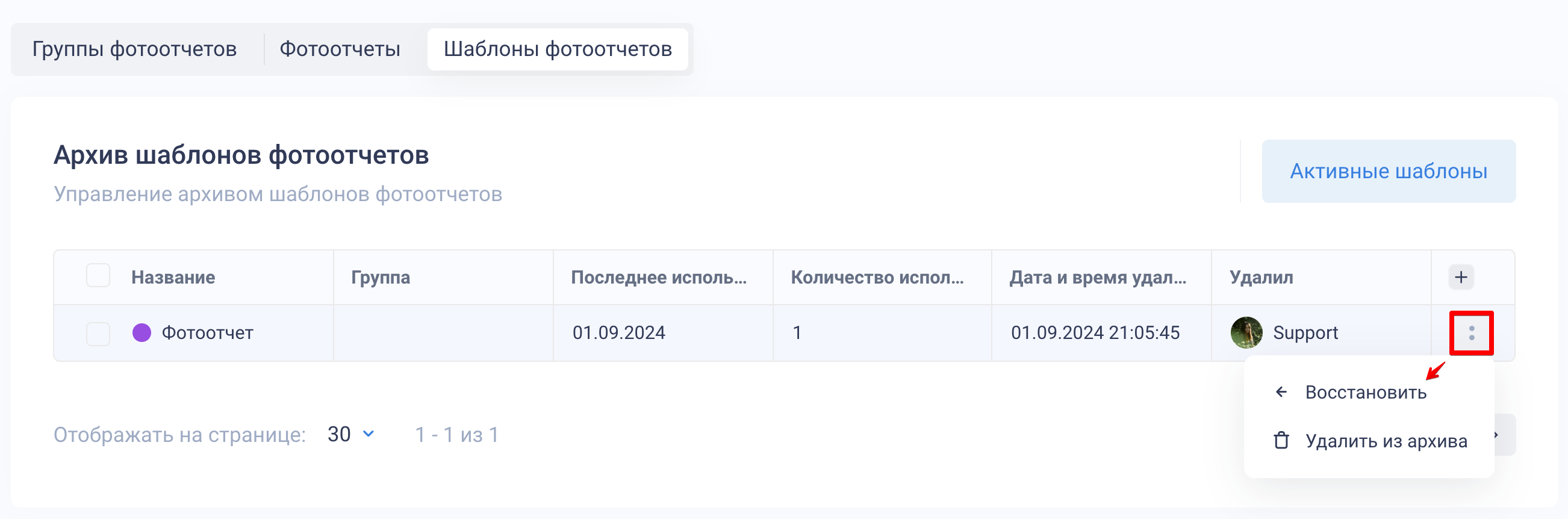 Чтобы удалить шаблон фотоотчета навсегда или восстановить его из архива, нажмите кнопку «:» справа от него.