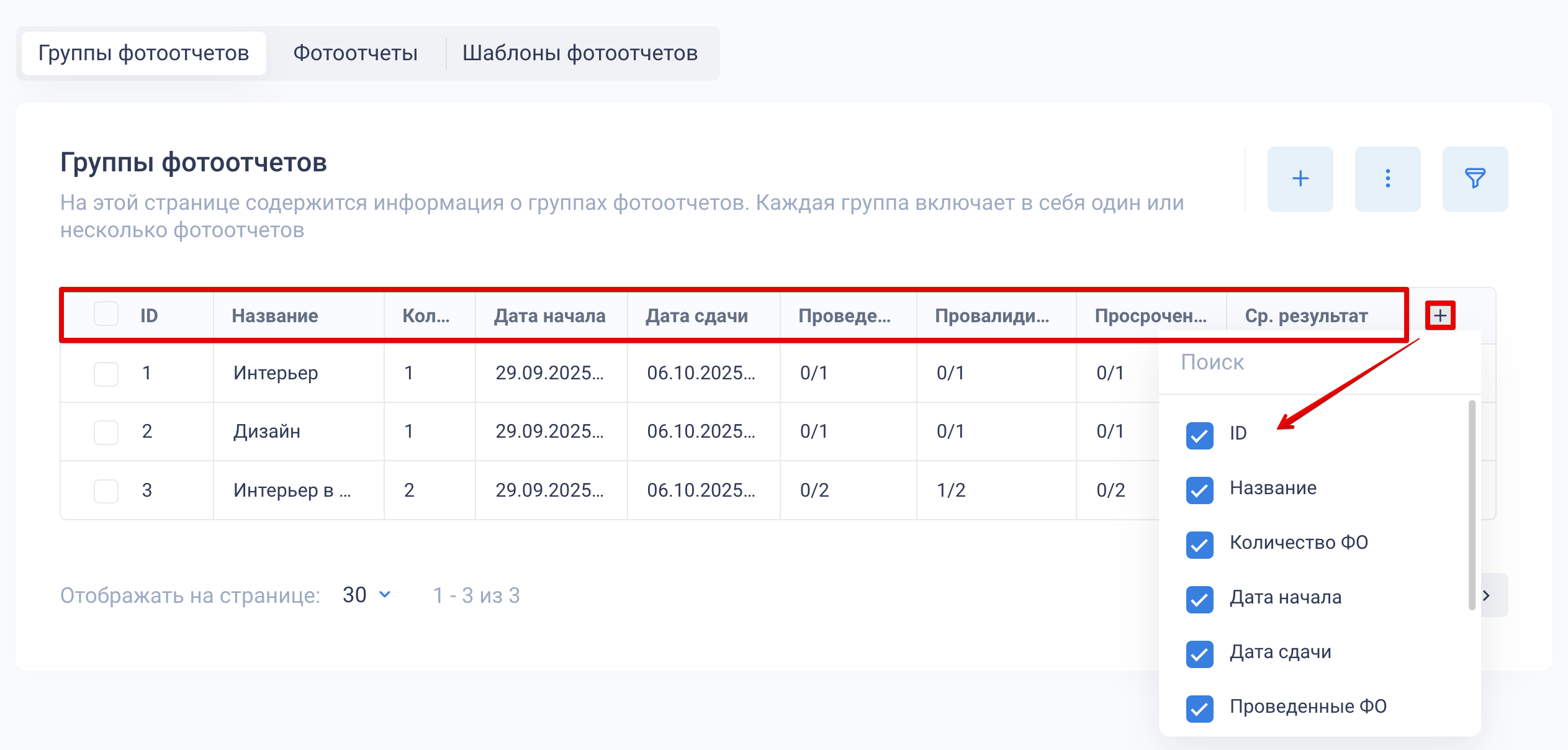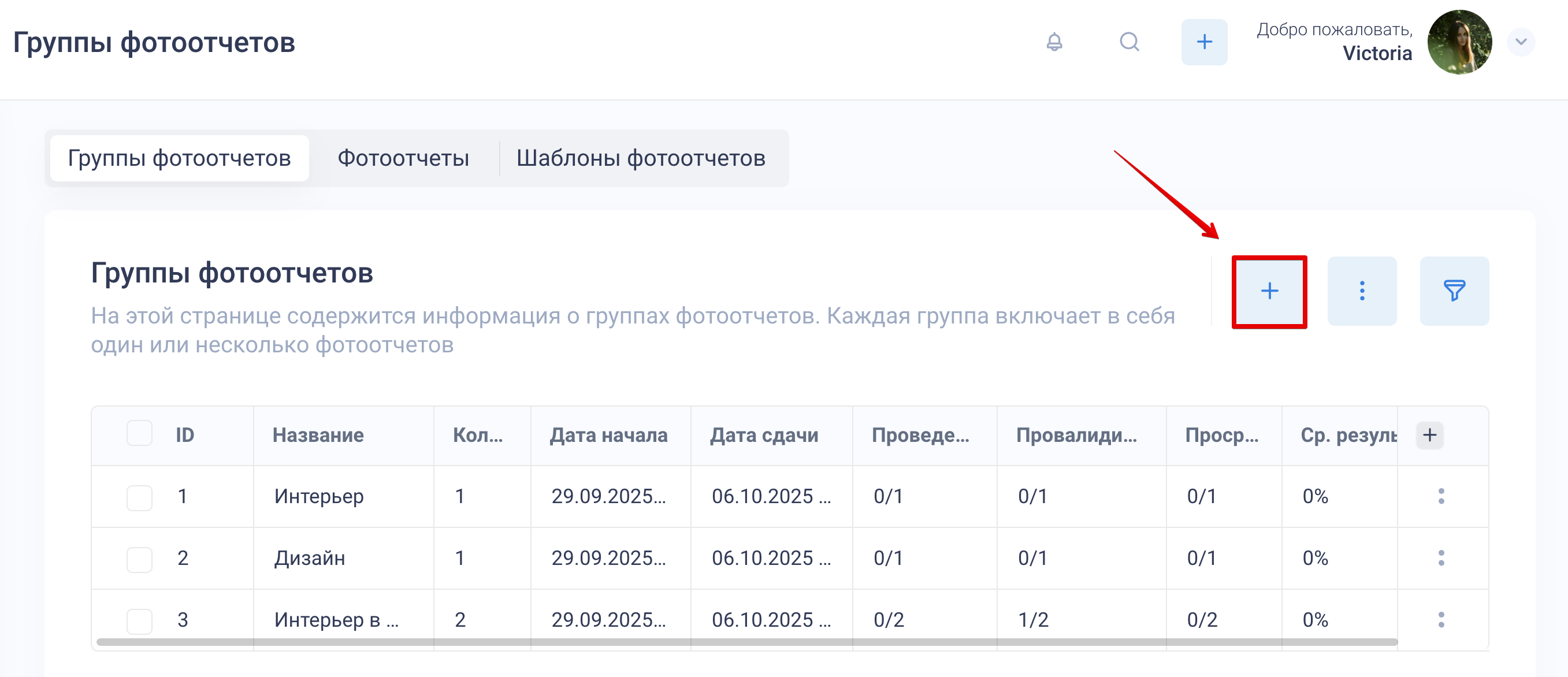 Кнопка «+» в верхнем правом углу таблицы позволяет создать фотоотчет и добавить его в группу — доступно единичное и массовое создание.