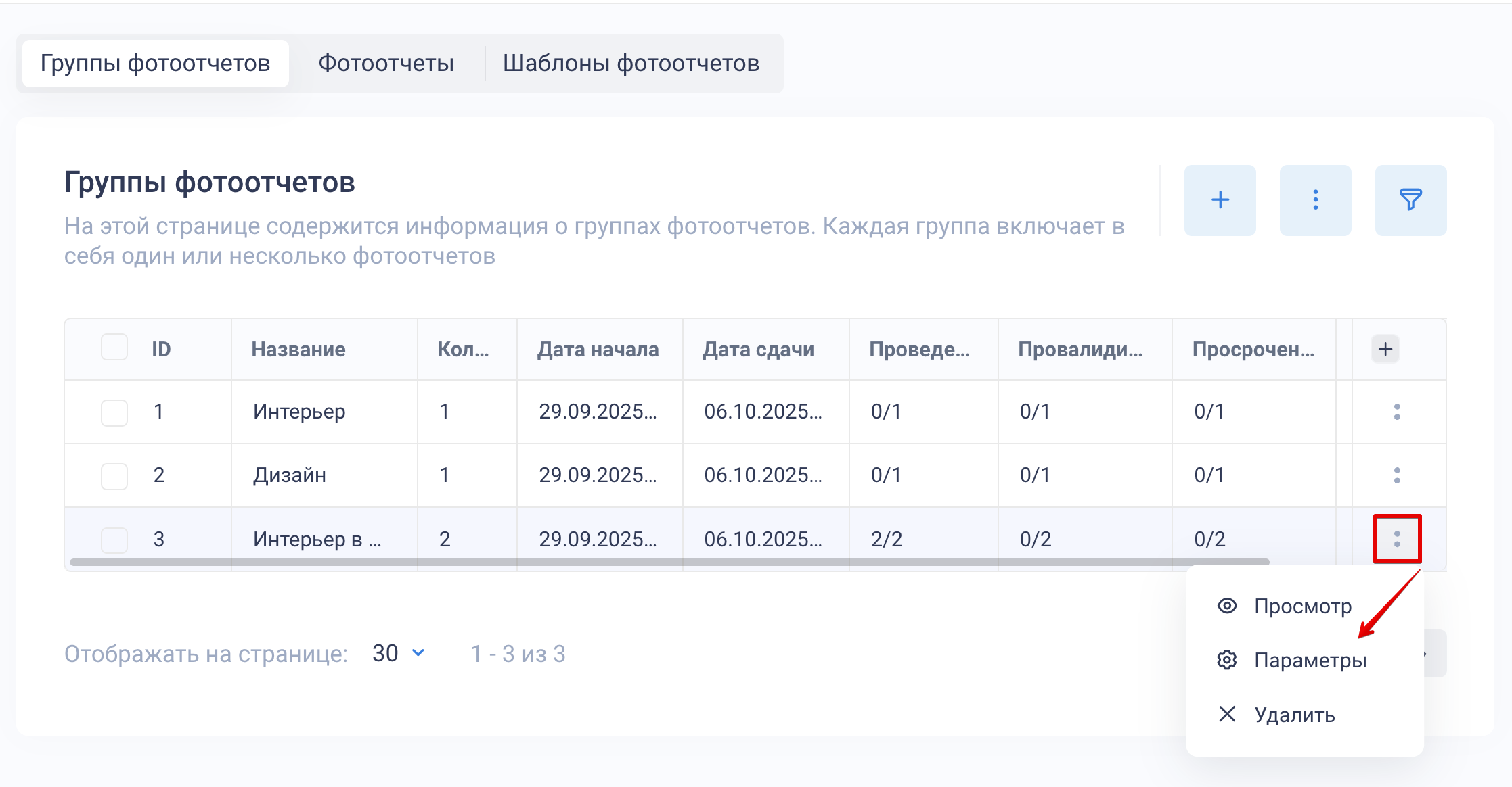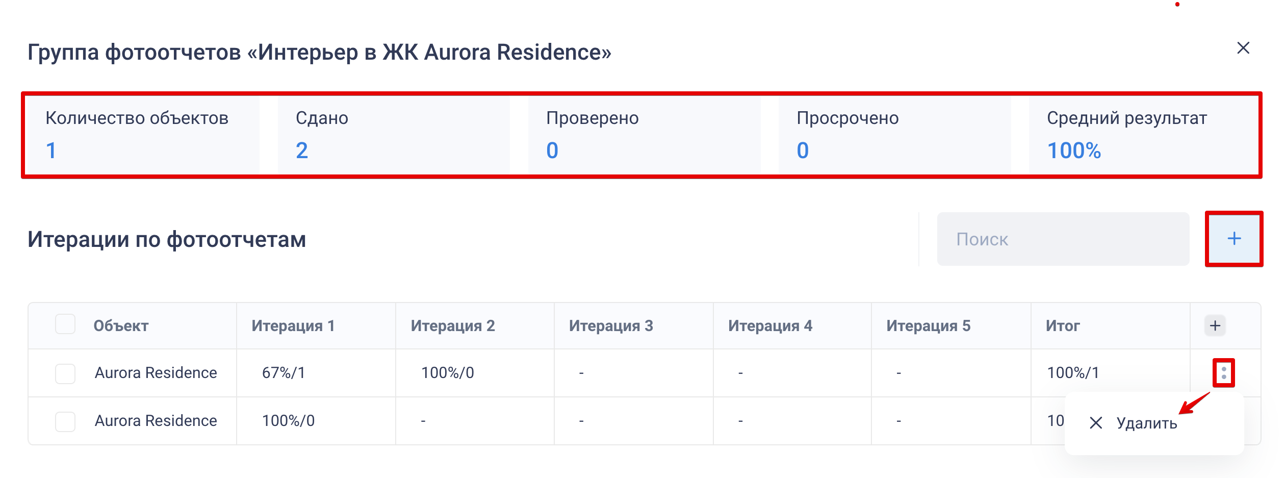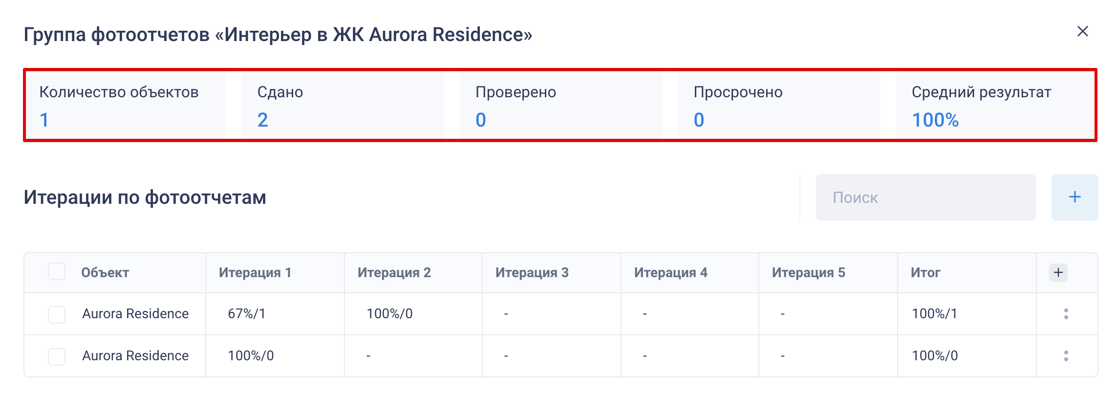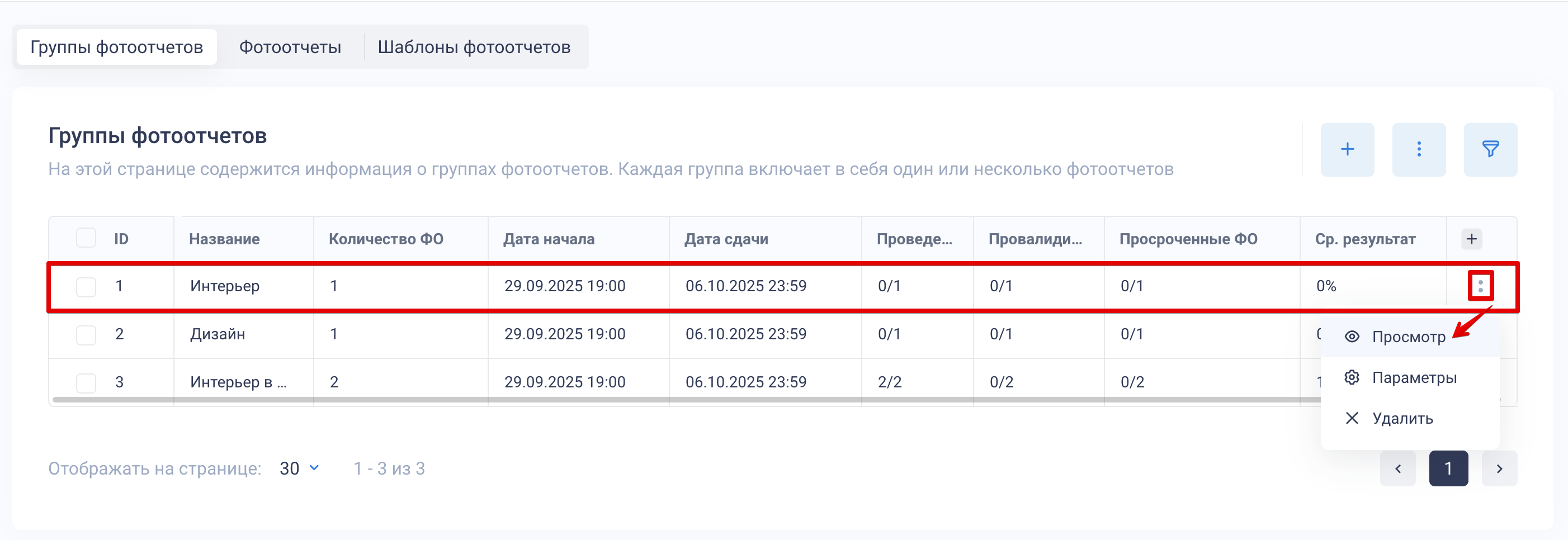 Чтобы просмотреть динамику по итерациям для группы фотоотчетов, нажмите «:» > «Просмотр» или кликните по строке с группой.