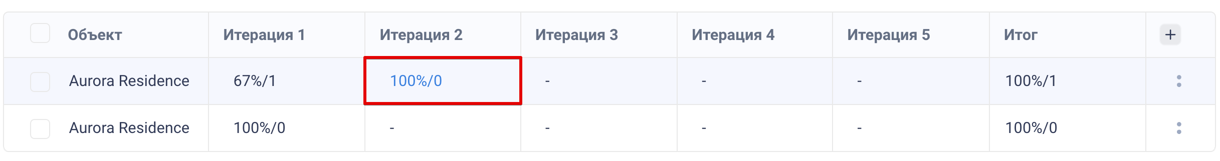 Итерация от 1 до 5 (показываются последние 5 итераций, максимум 20) — для каждой итерации отображается формат «X%/Y», где X — результат по итерации, Y — количество замечаний.
