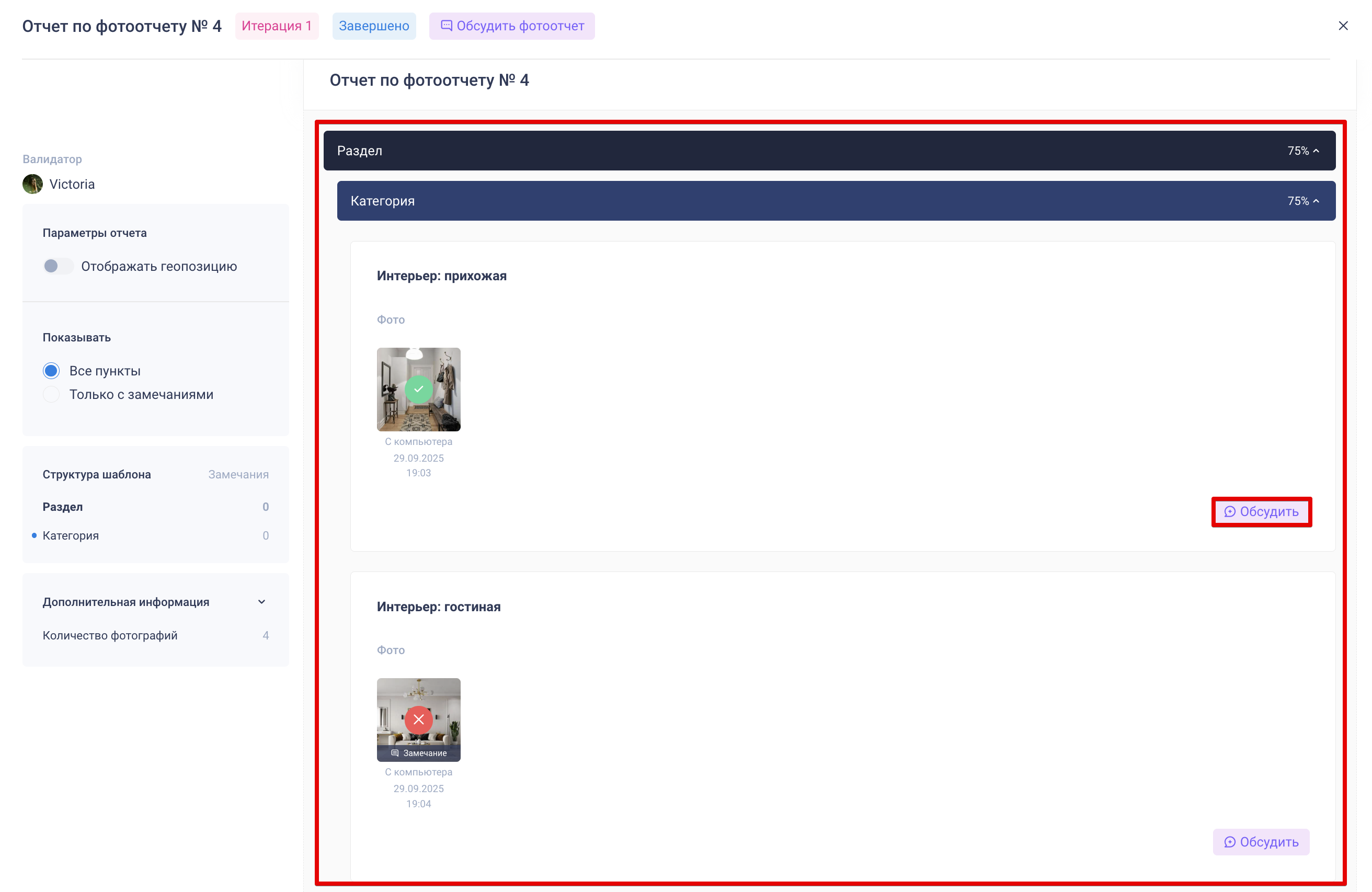 Вверху: порядковый № фотоотчета, № итерации, статус, кнопка «Обсудить» для создания диалога прямо из него