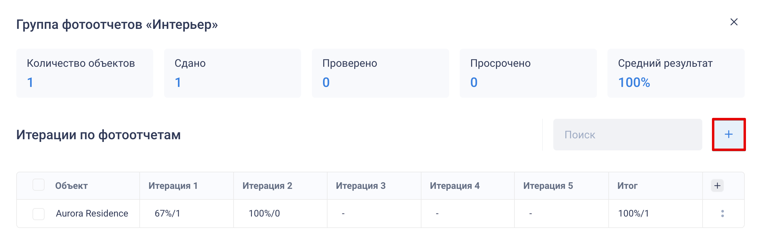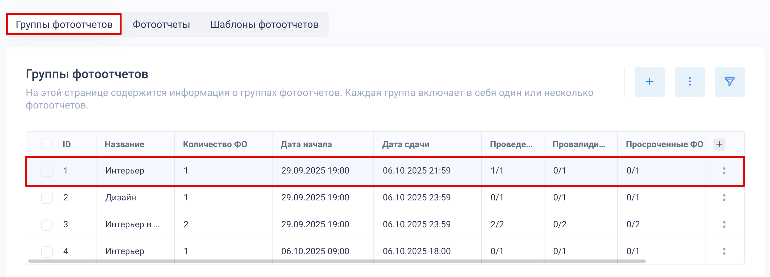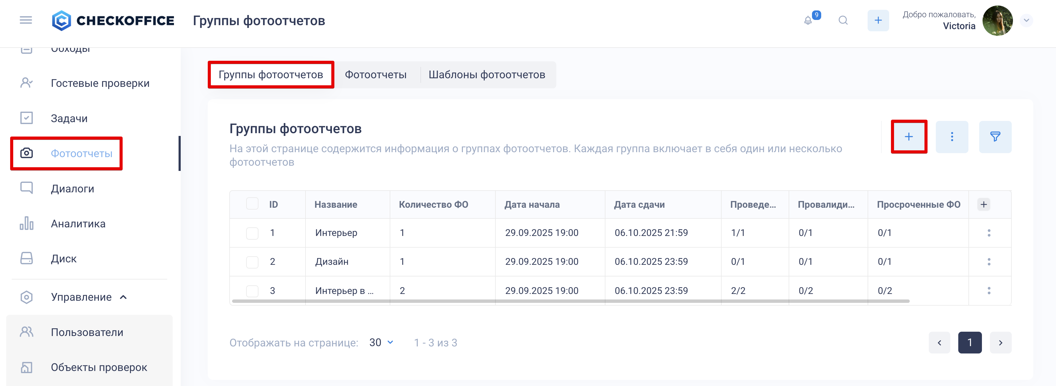 1. Боковое меню слева > раздел «Фотоотчеты» > вкладка «Группы фотоотчетов» > кнопка «+» в верхнем правом углу таблицы