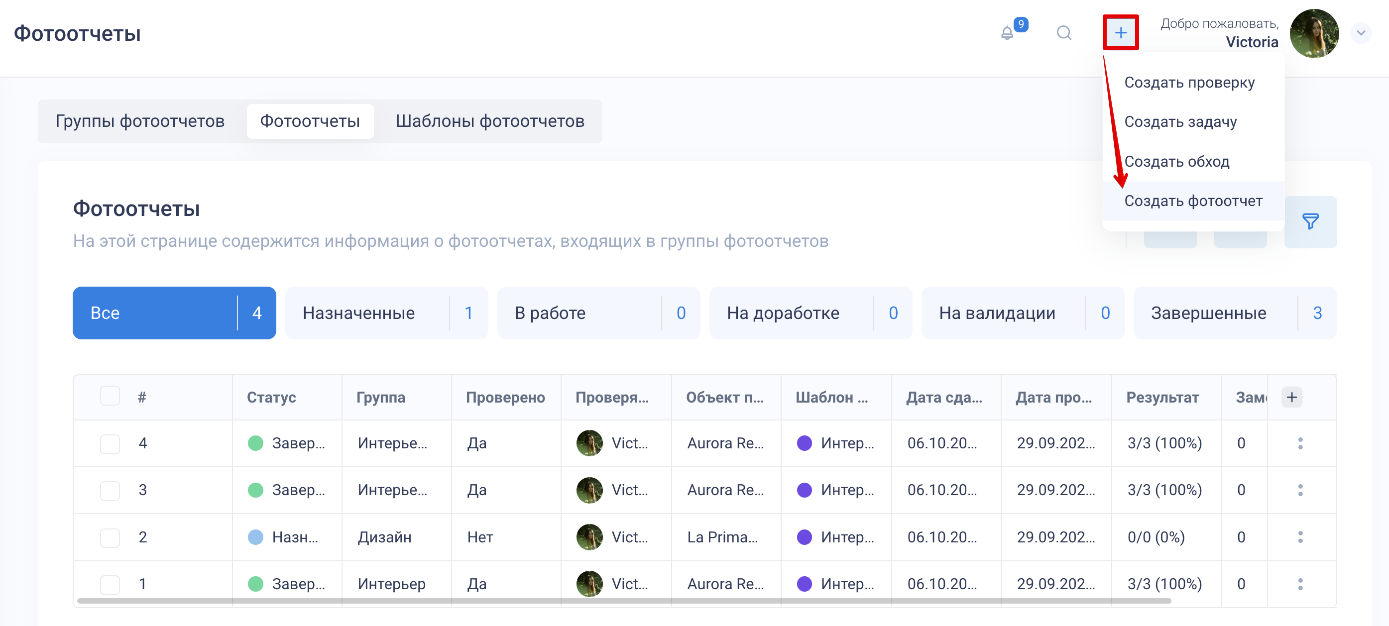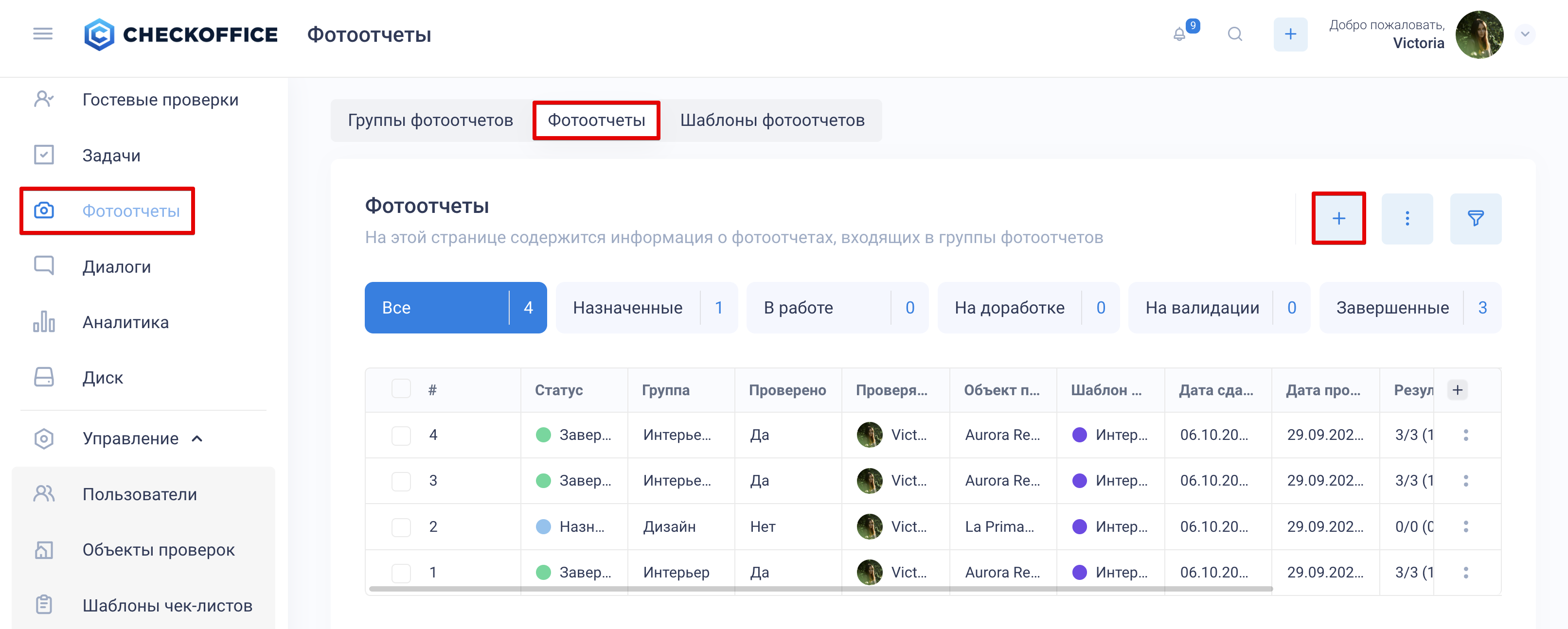 3. Боковое меню слева > раздел «Фотоотчеты» > вкладка «Фотоотчеты» > кнопка «+» верхнем правом углу таблицы