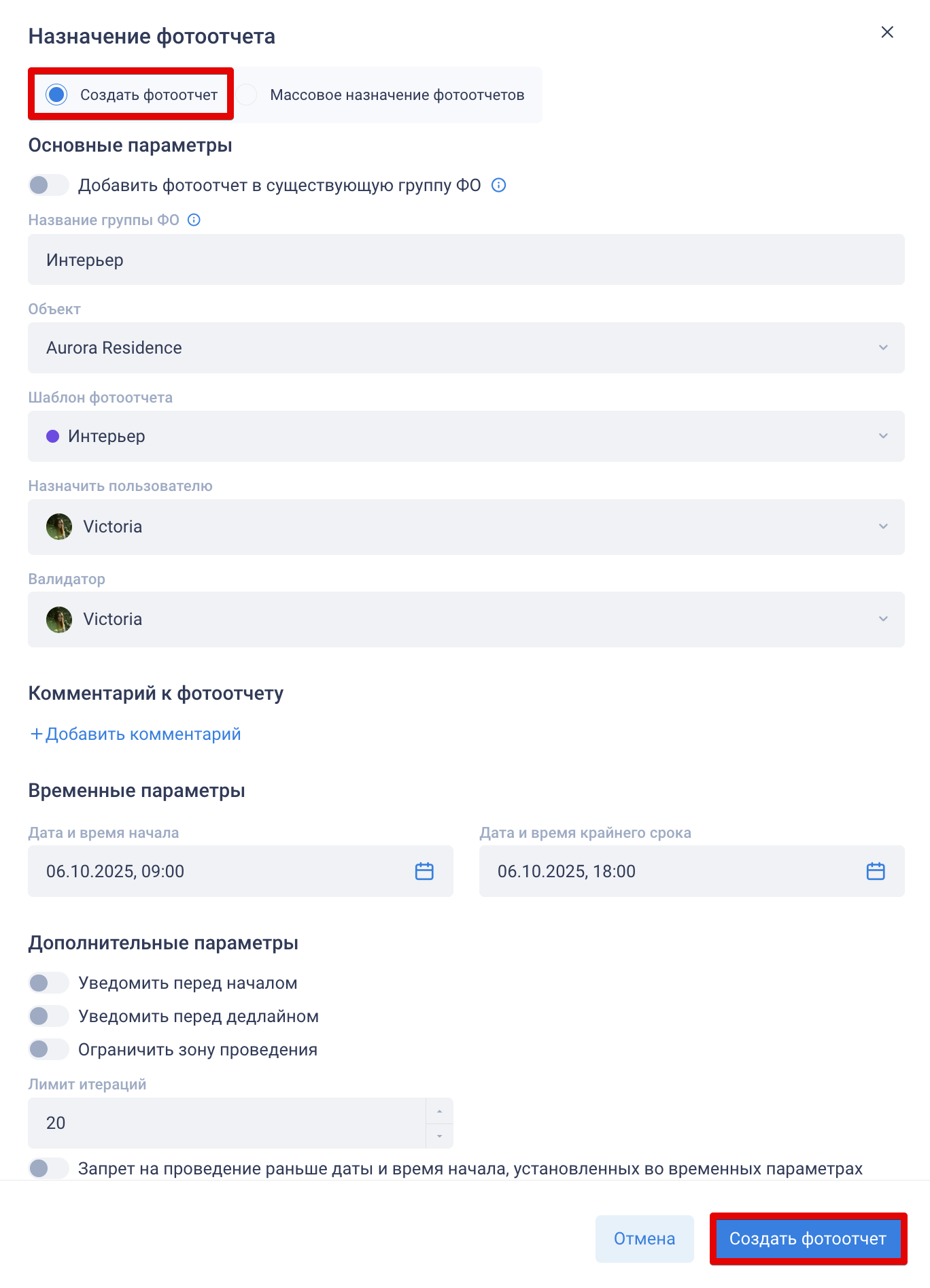 В открывшейся форме выберите «Создать фотоотчет» и настройте параметры: