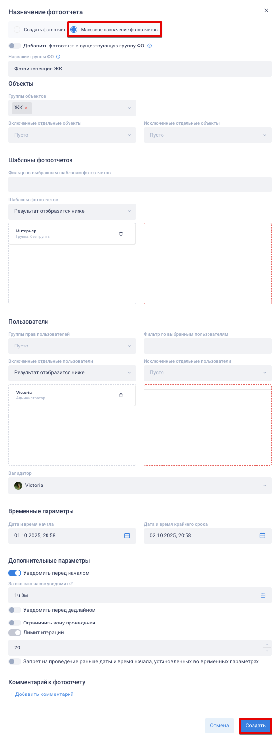 В открывшейся форме выберите «Массовое назначение фотоотчетов» и настройте параметры: