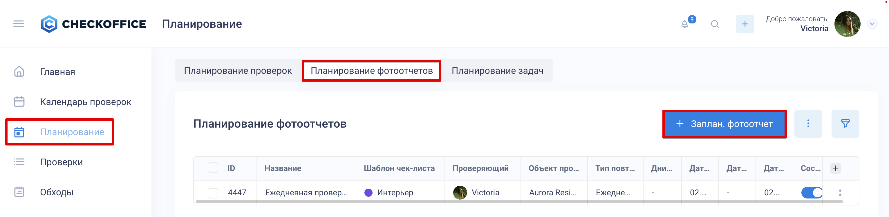Боковое меню слева > раздел «Планирование» > вкладка «Планирование фотоотчетов» > кнопка «Заплан. фотоотчет» в верхнем правом углу