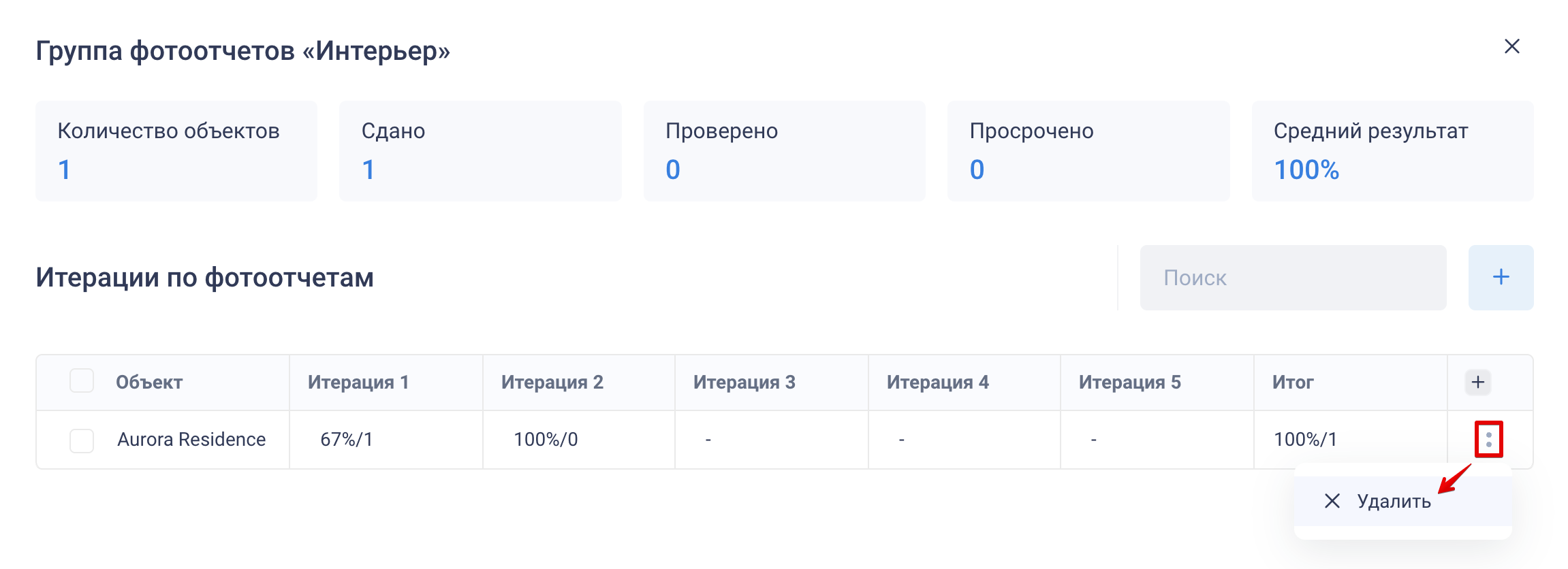 Как удалить фотоотчет со всеми итерациями:1. На вкладке «Группы фотоотчетов» кликнуть по группе > кнопка «:» > Удалить