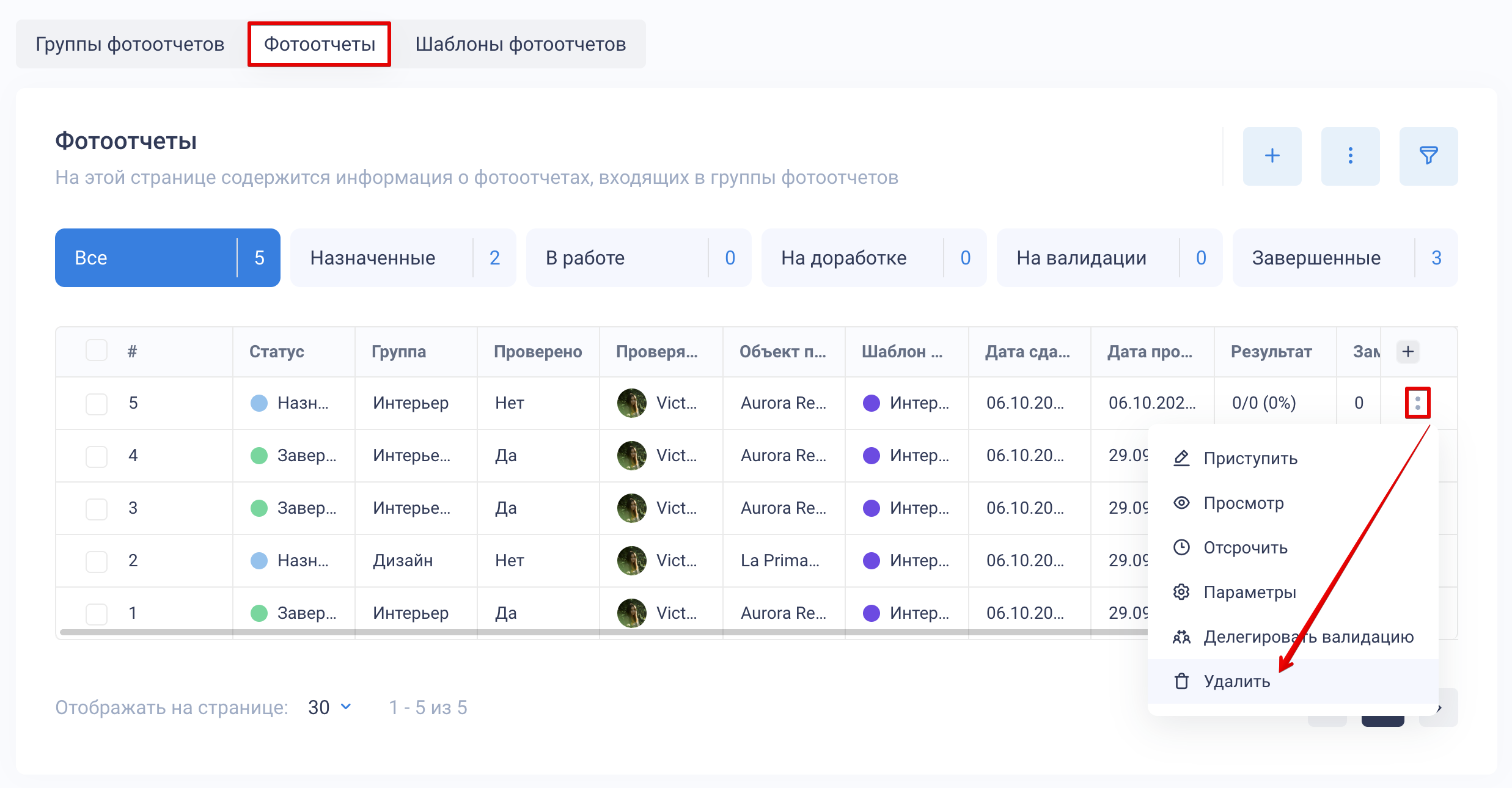 2. На вкладке «Фотоотчеты» кнопка «:» > Удалить