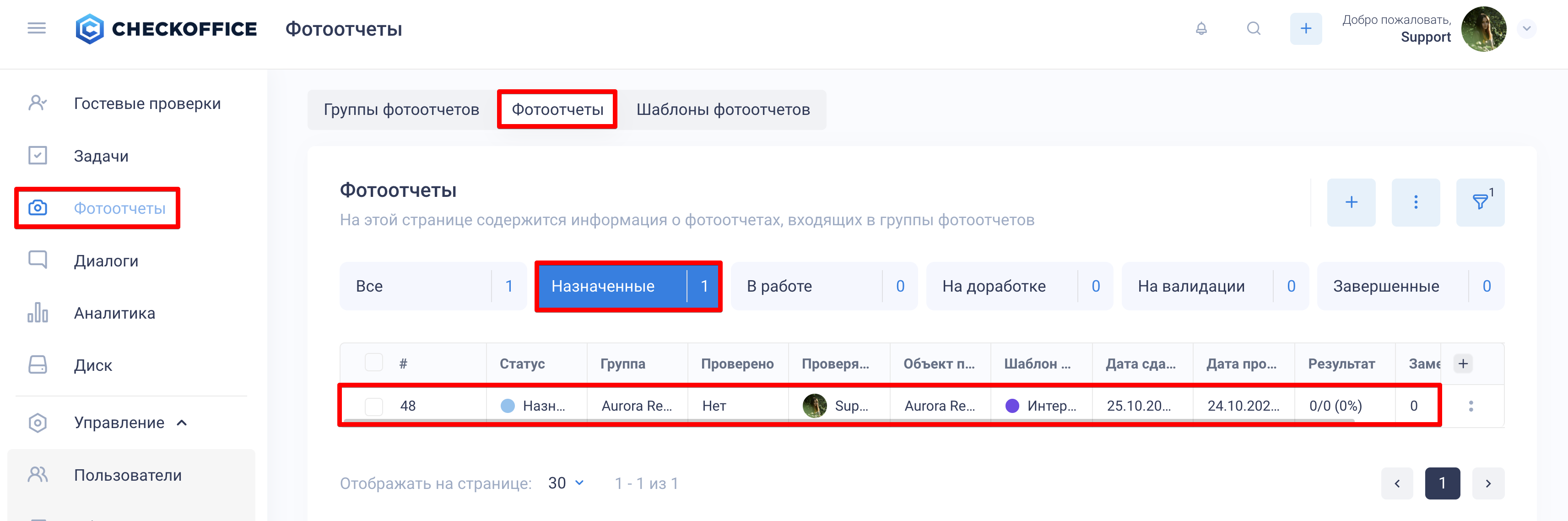 Откройте фотоотчет. Боковое меню слева > раздел «Фотоотчеты» > вкладка «Фотоотчеты» > «Назначенные»