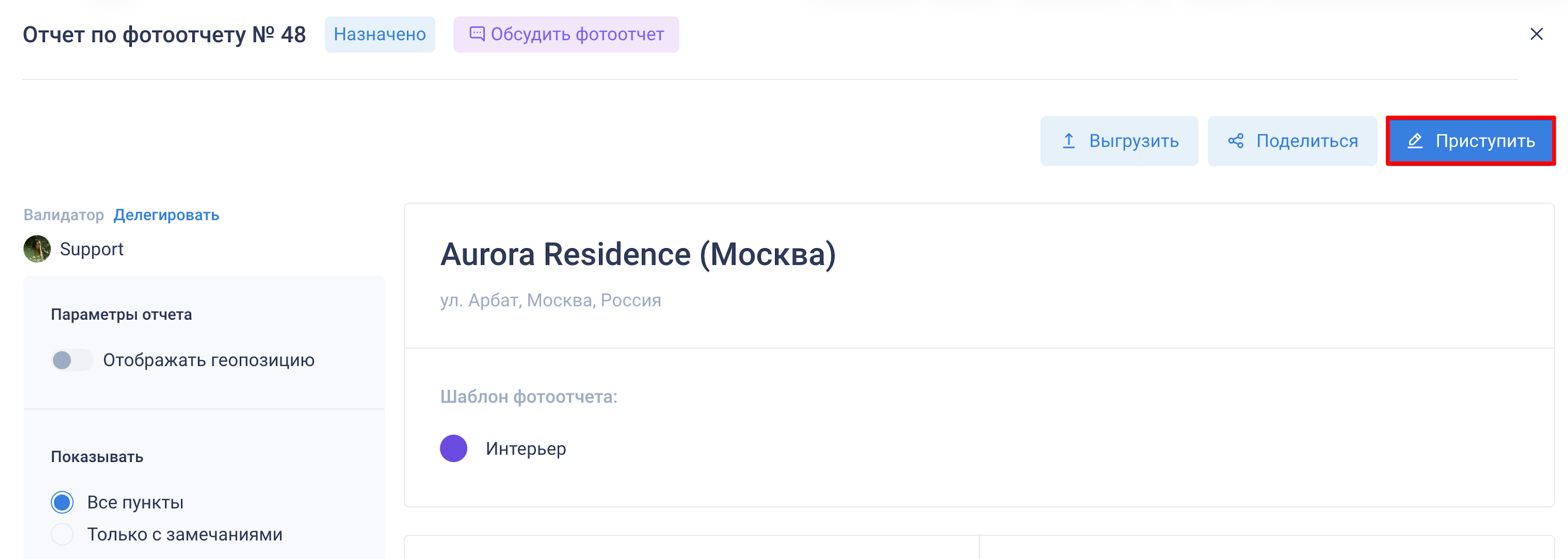 Откройте фотоотчет на вкладке «На валидации» и нажмите «Начать валидацию». Боковое меню слева > раздел «Фотоотчеты» > вкладка «Фотоотчеты» > «На валидации»