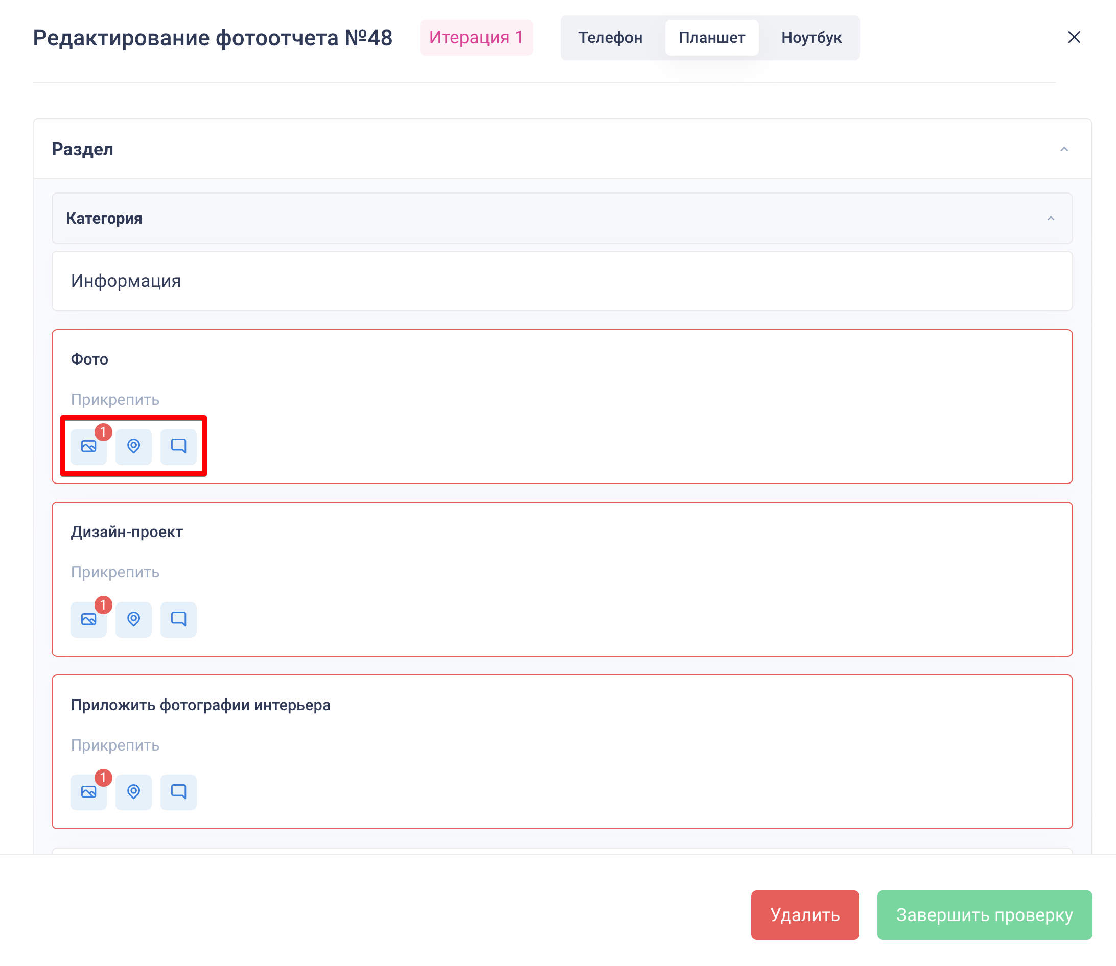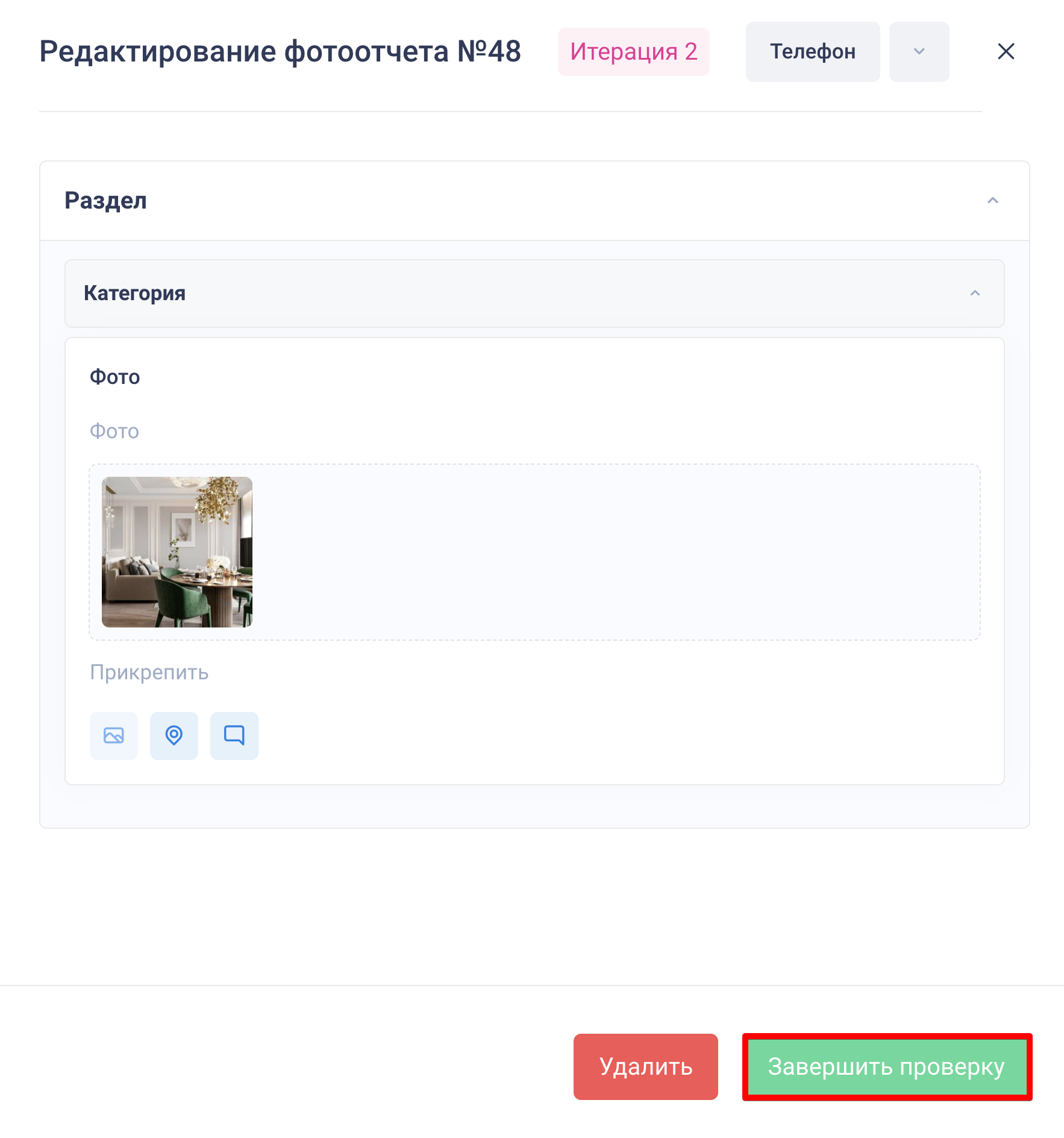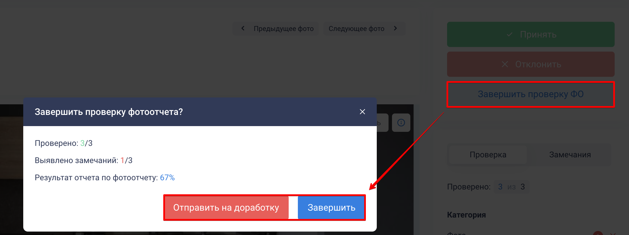 Готово! Нажмите «Завершить проверку», и фотоотчет вернется на повторную валидацию.