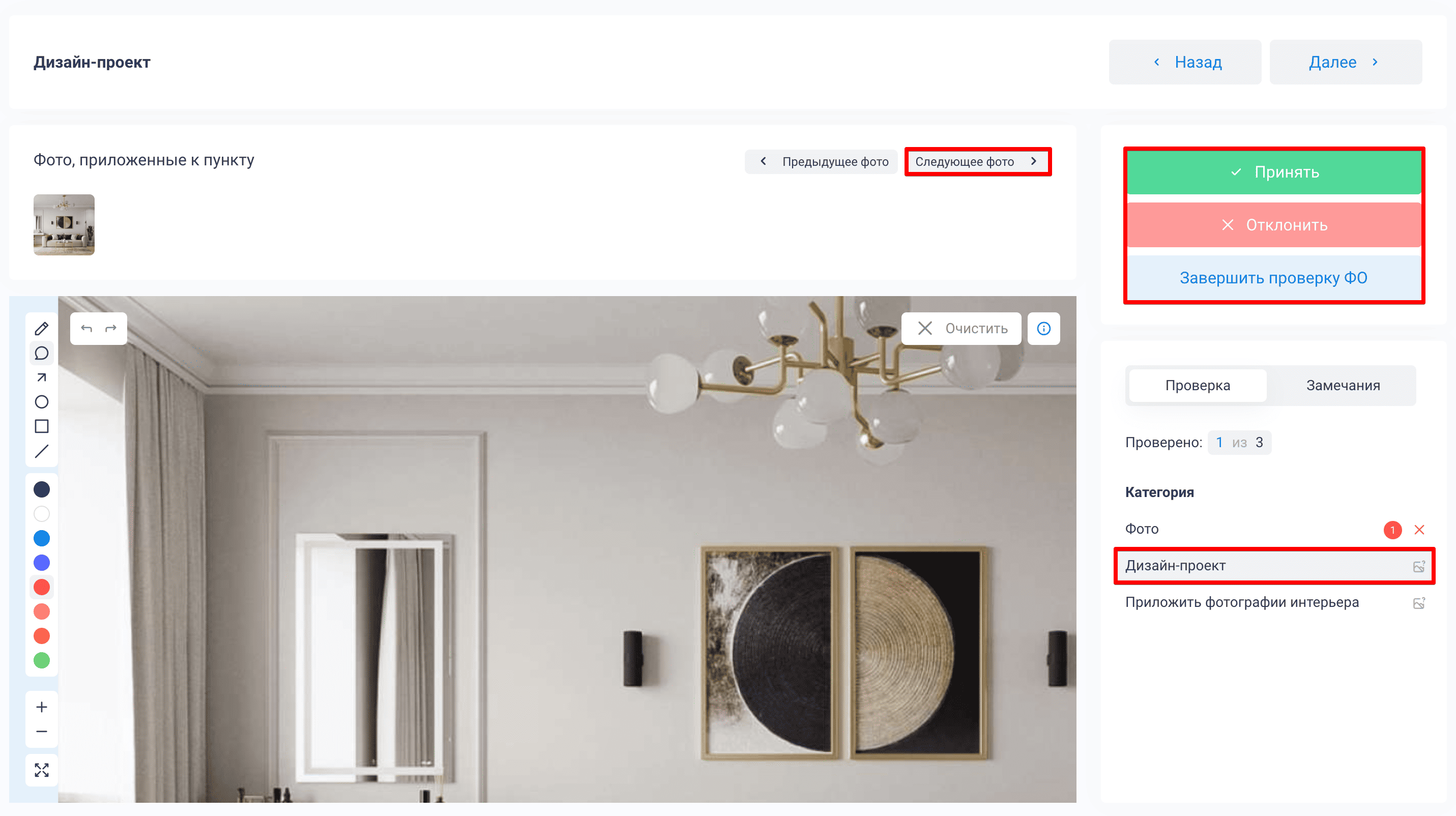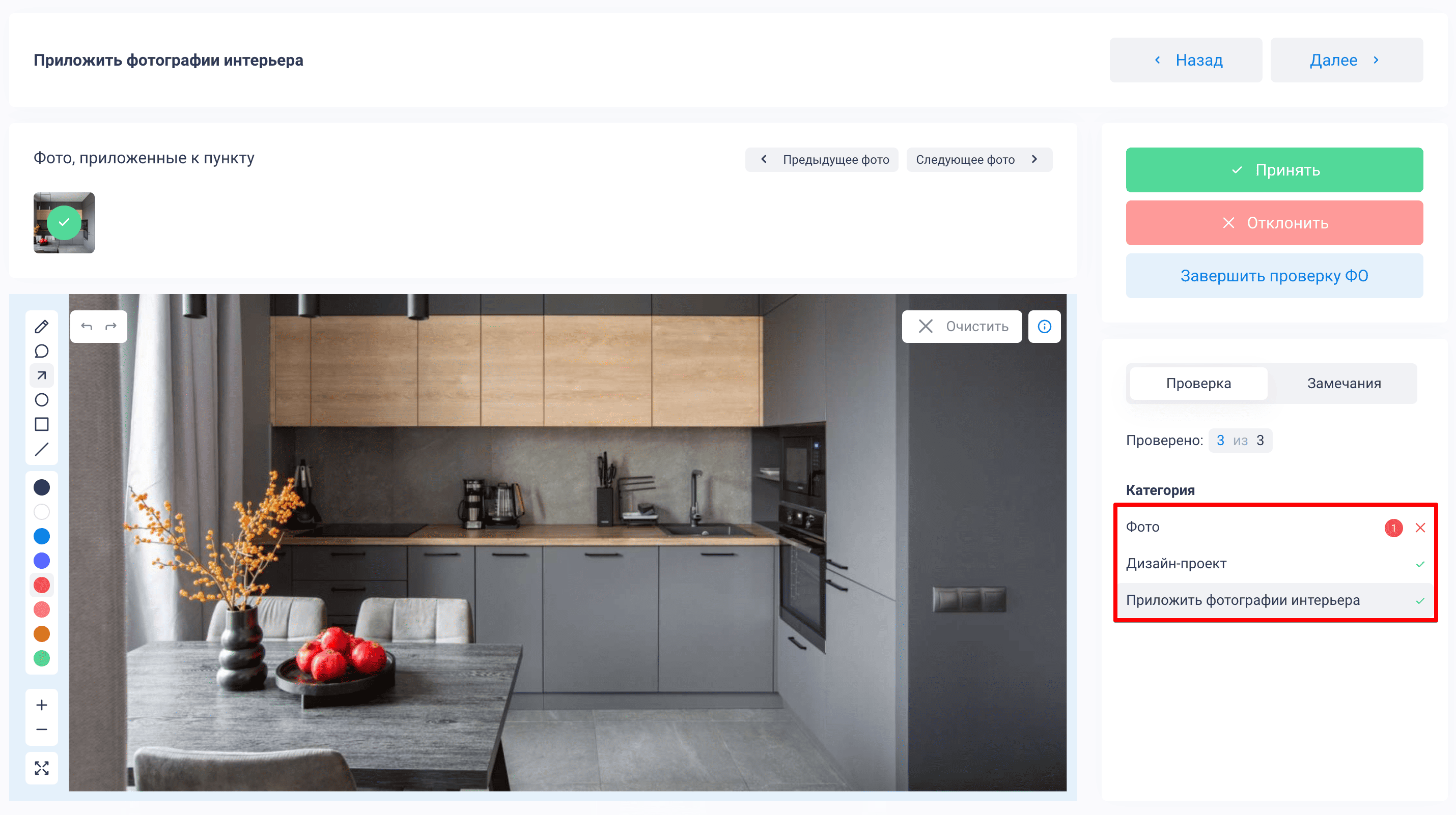 Если к фотографии добавлены замечания, можно отклонить ее, чтобы вернуть на доработку.