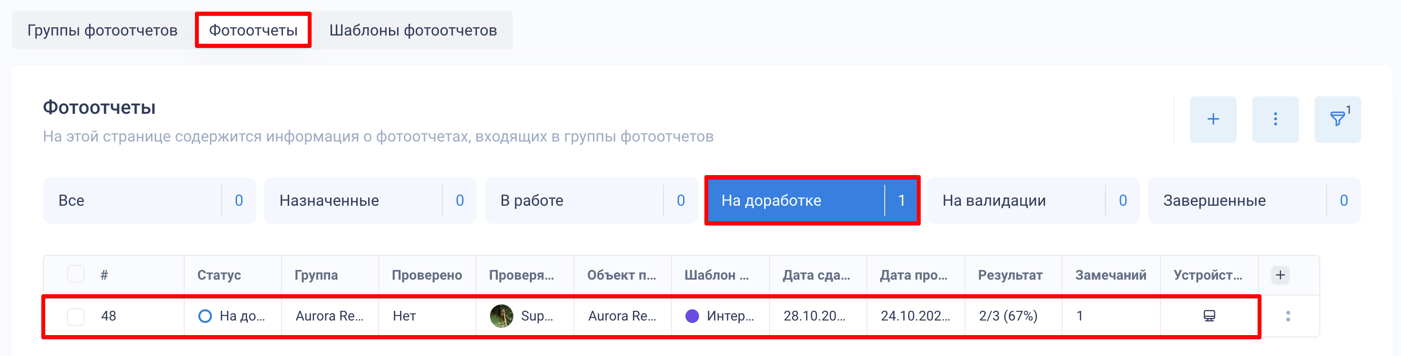 «Отправить на доработку» — отправка фотоотчета проверяющему на доработку; недоступно, если достигнут лимит итераций или результат = 100%.