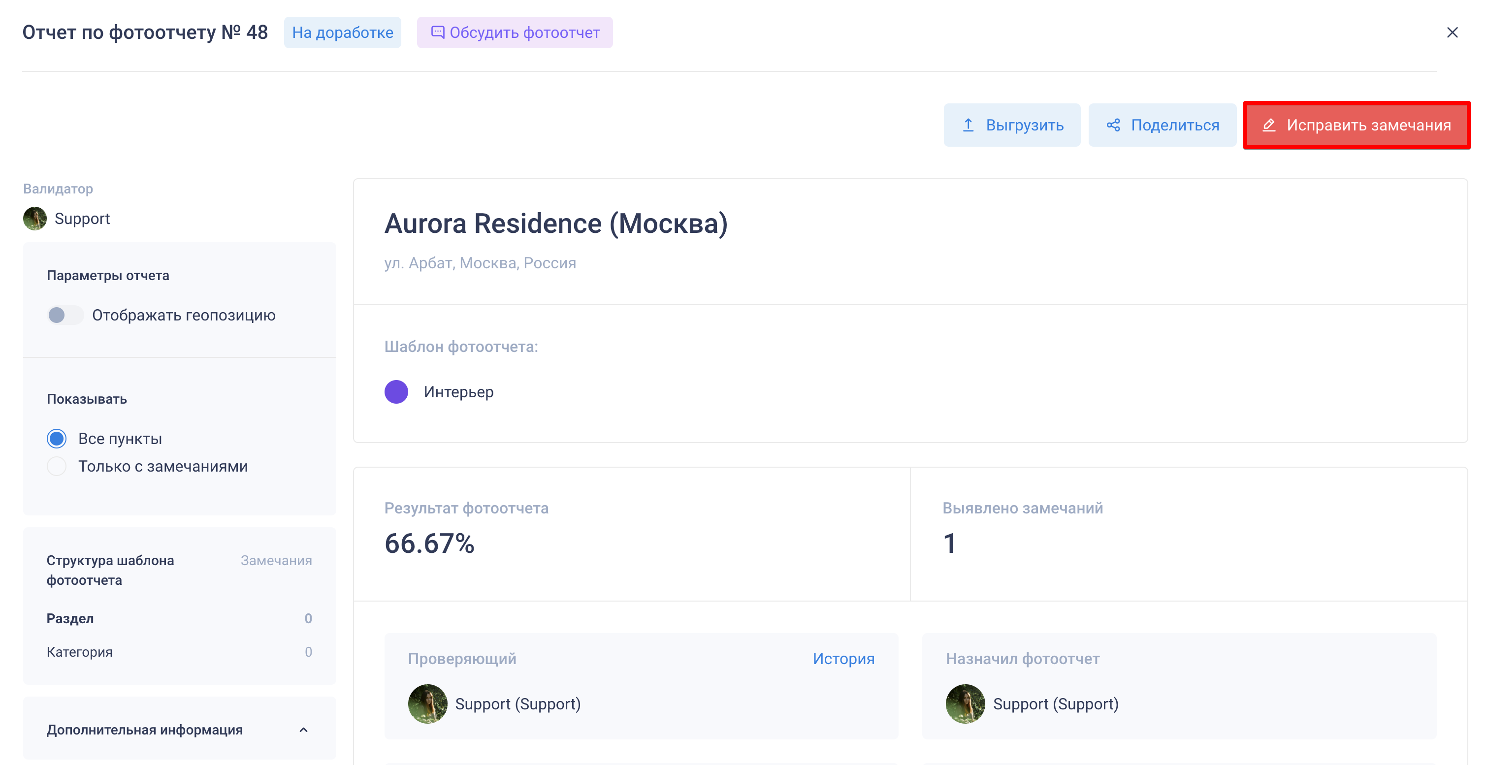 Перейдите во вкладку «На доработке», откройте фотоотчет и нажмите «Исправить замечания» — откроются только критерии с замечаниями.Боковое меню слева > раздел «Фотоотчеты» > вкладка «Фотоотчеты» > «На доработке»