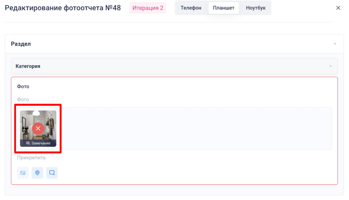 Если в одном и том же критерии (пункте) было несколько фотографий, все они видны; проблемная фотография помечена как «Замечание».