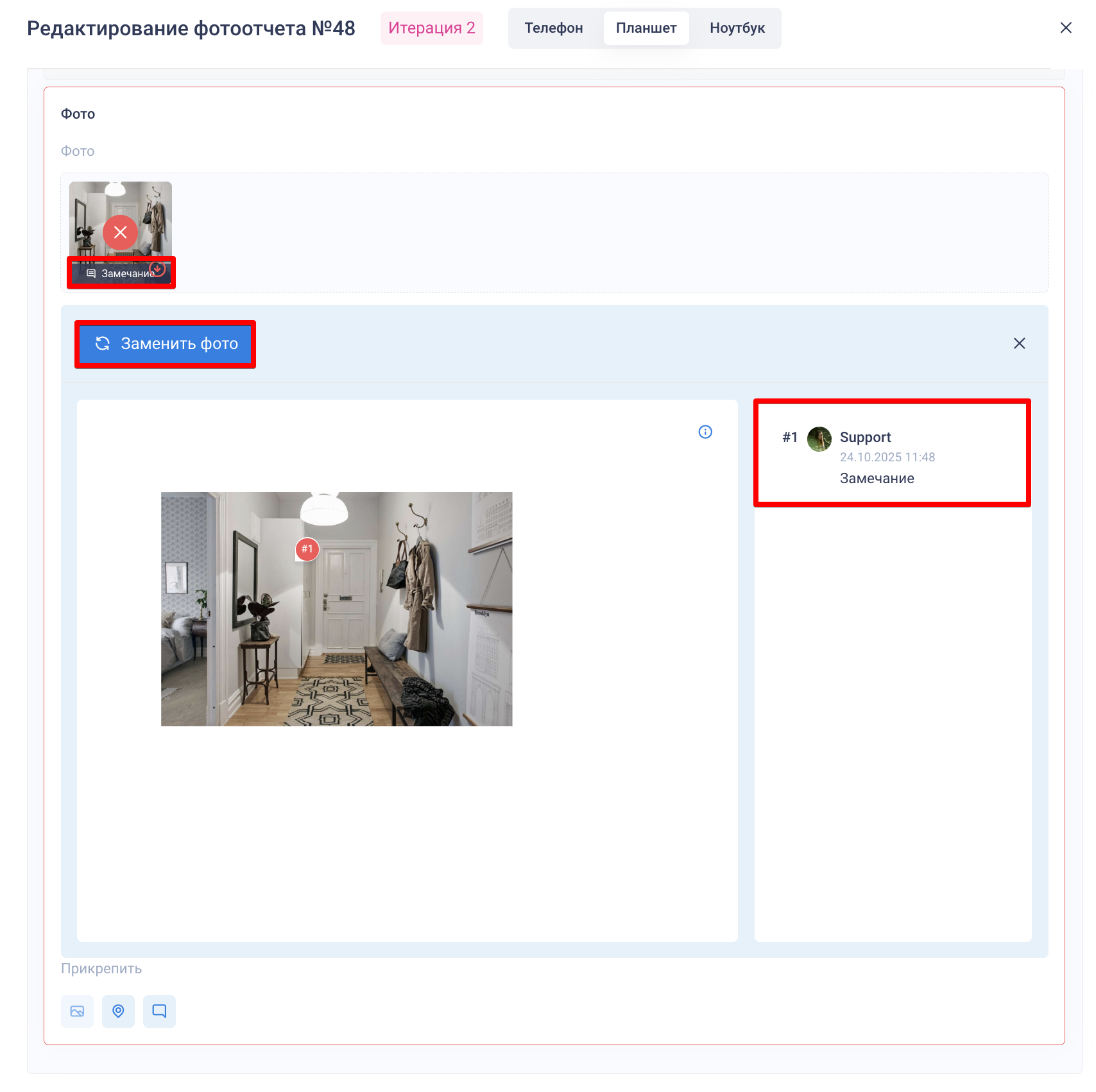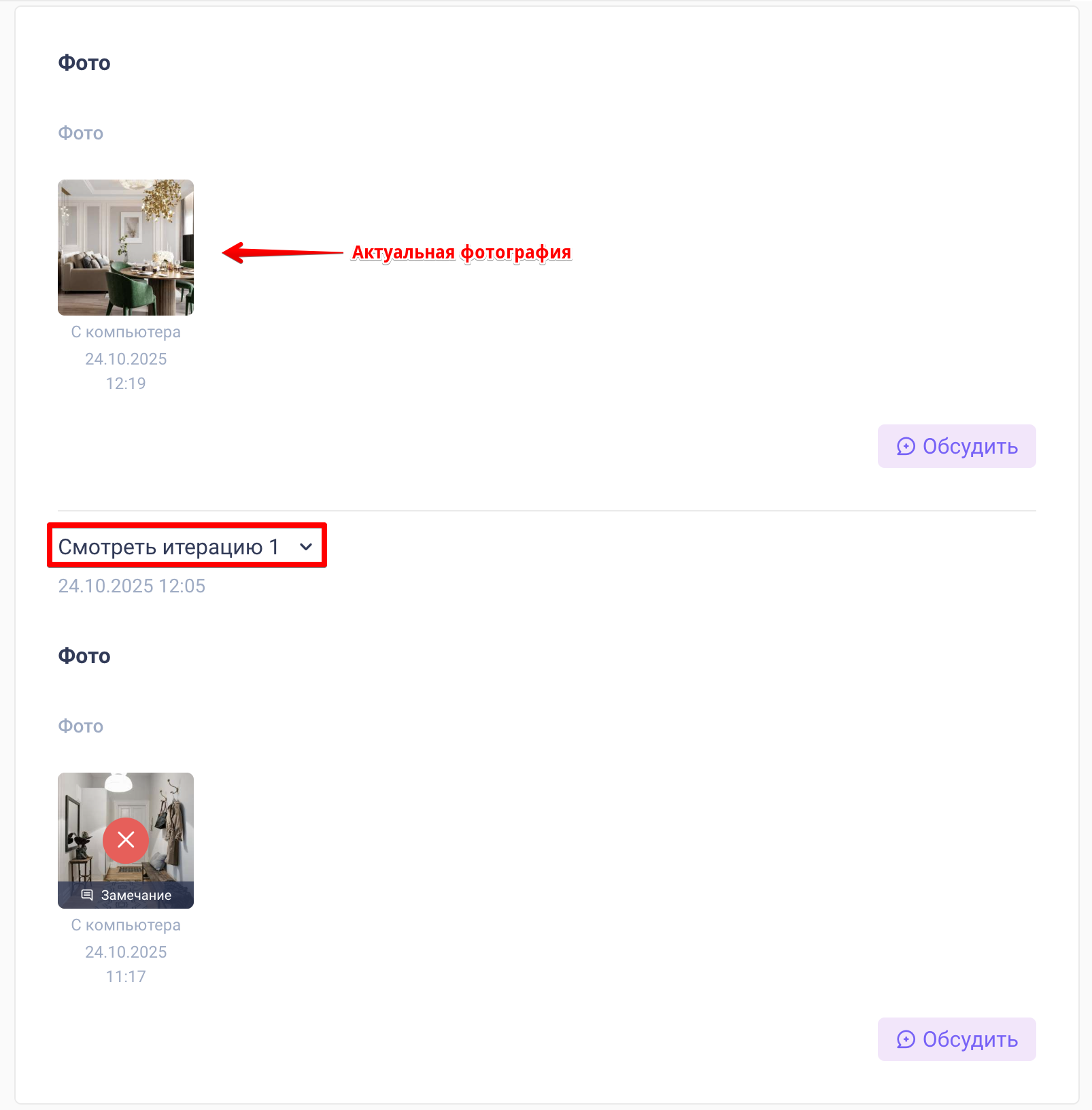 Добавленные во время доработки фотографии отображаются отдельным блоком. Ниже доступна история итераций с их №.
