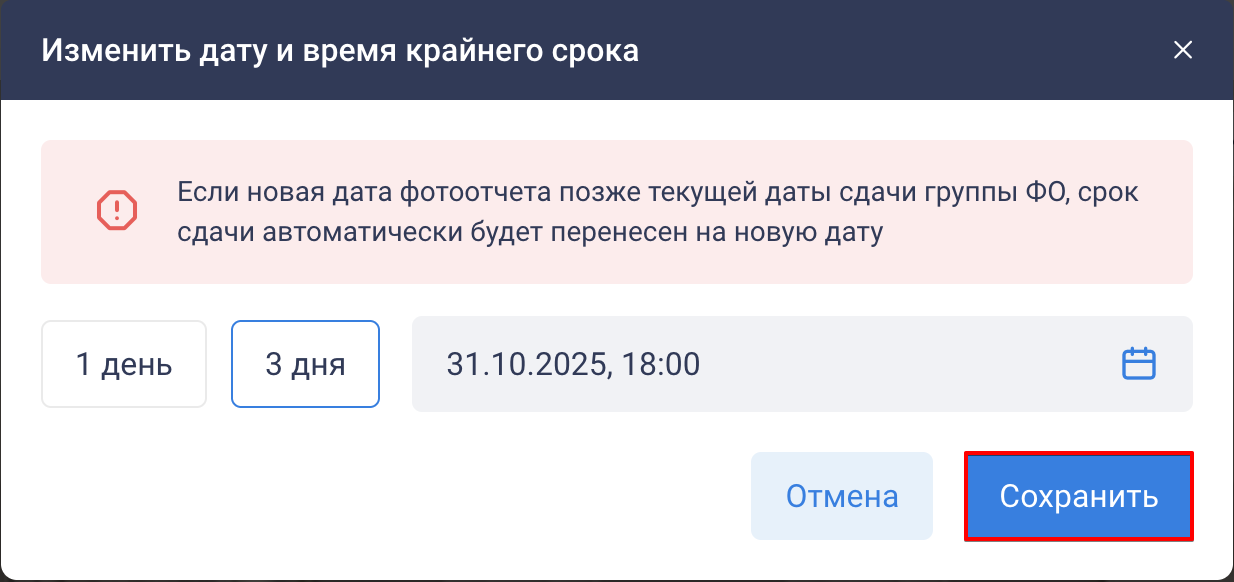 При отправке на доработку откроется окно «Изменить дату и время крайнего срока»: можно изменить дедлайн > «Сохранить». Если не изменять дедлайн и срок истечет — фотоотчет будет просрочен.
